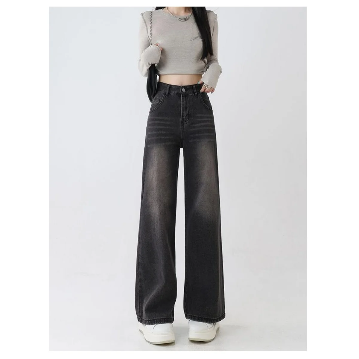 ニューヴィンテージストレートレッグレディースジーンズハイウエストルーズフィットトレンディロングパンツ春秋シーズンチャコールグレーデニムパンツ - TopDealBox