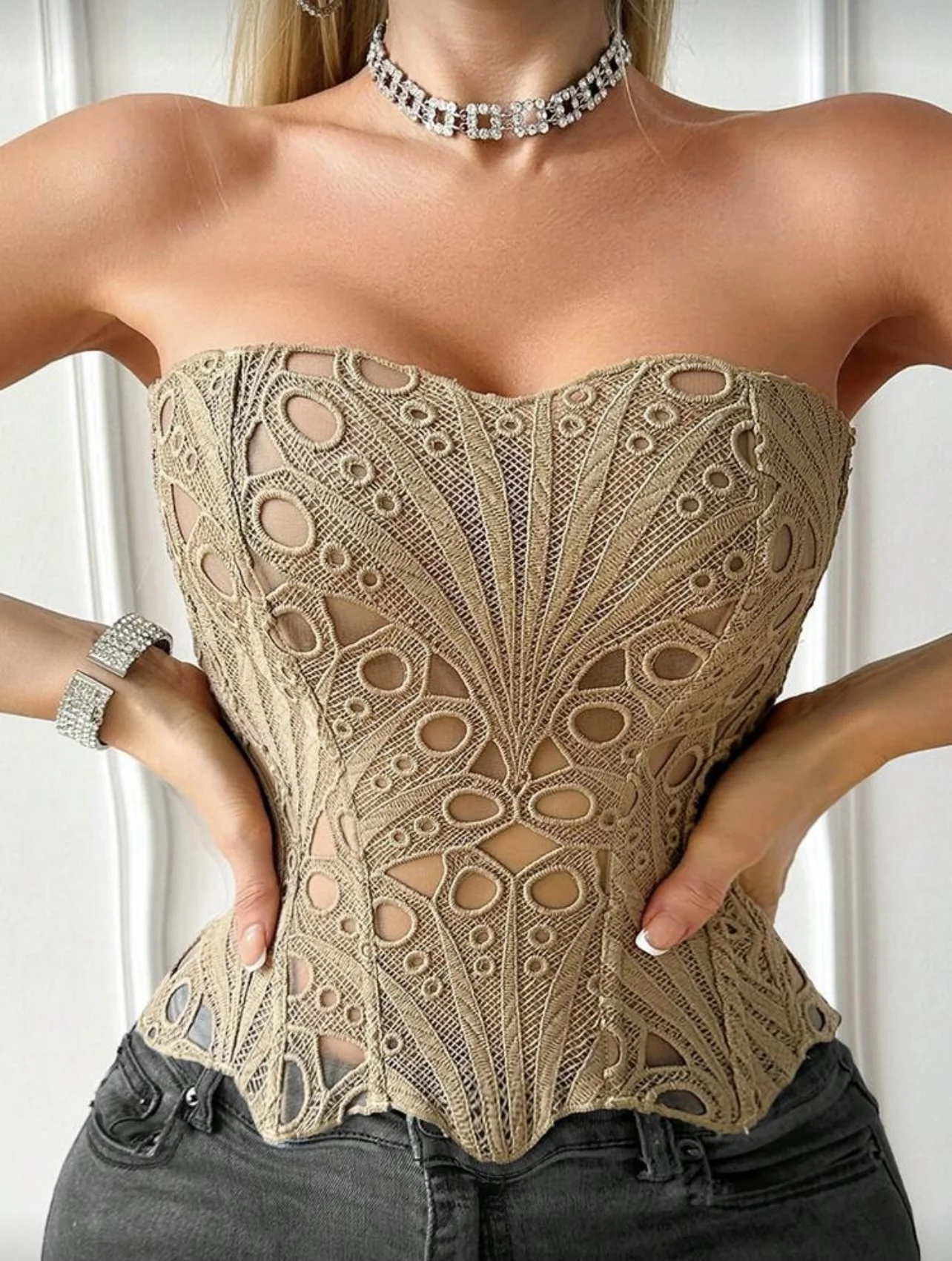 レーストリムのコサージュトップ、ショートベスト、ノースリーブのセクシーな女性スタイル、オフショルダーデザイン、ホリデーパーティーに適したスリムフィットトップ - TopDealBox