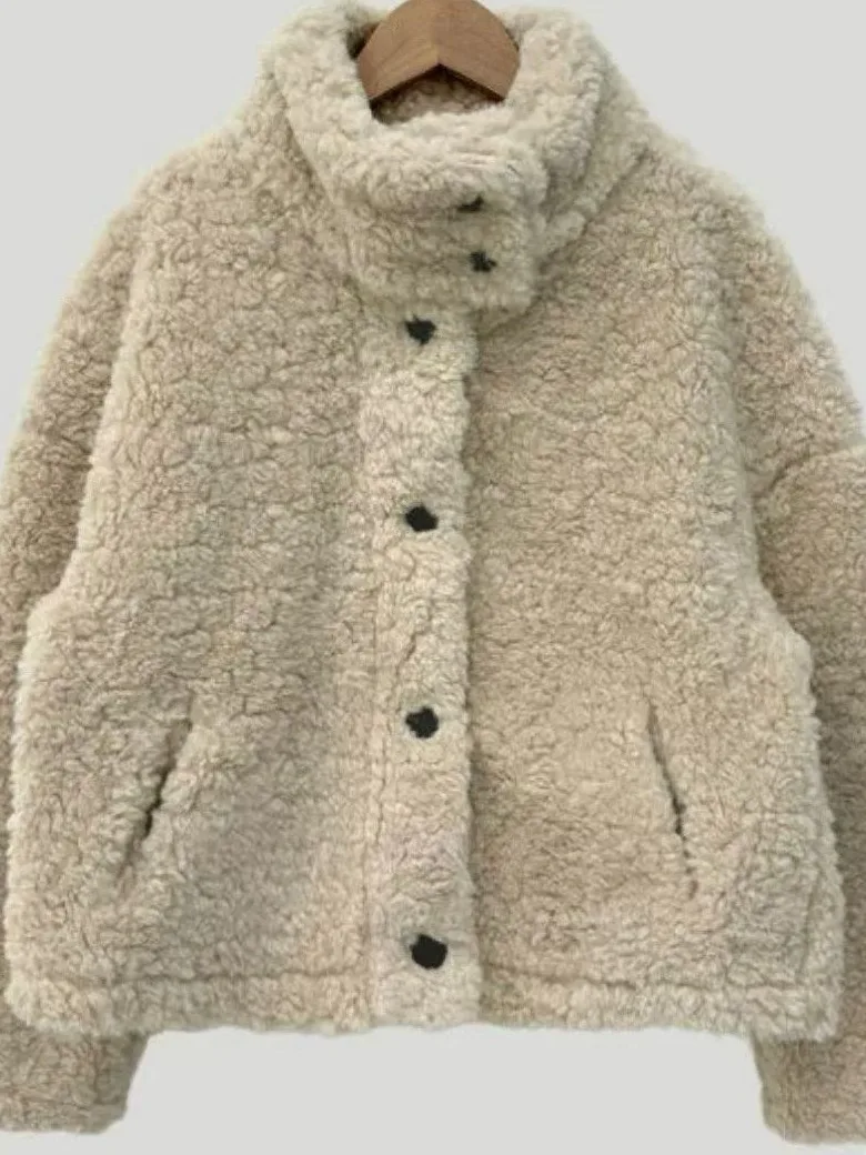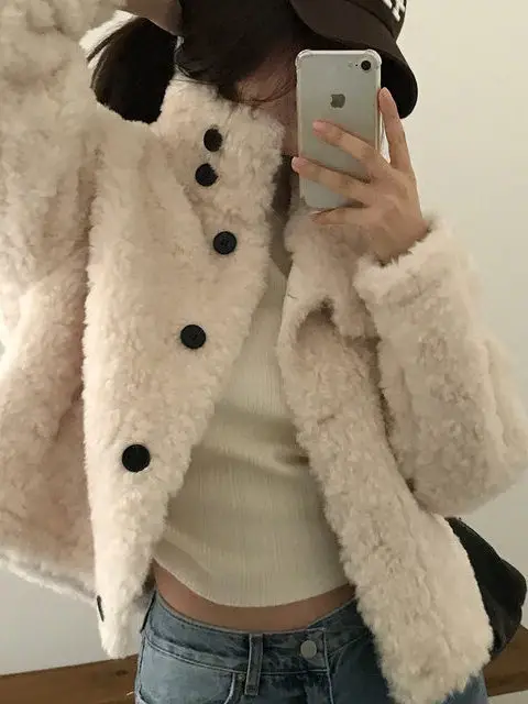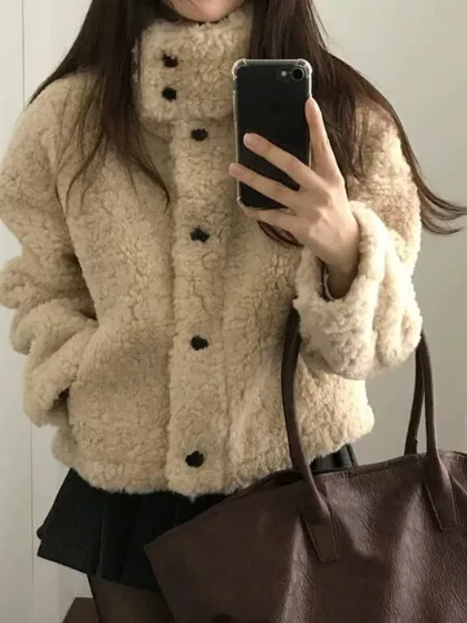 韓国風スタンドカラー暖かいショートラムファージャケット女性の秋冬シングルボタンコート痩身カレッジスタイルアウター - TopDealBox
