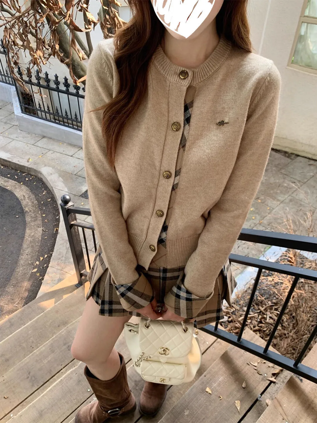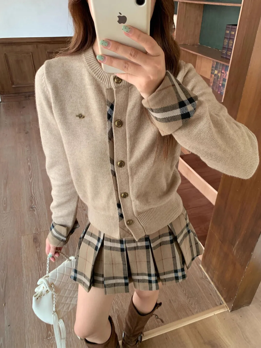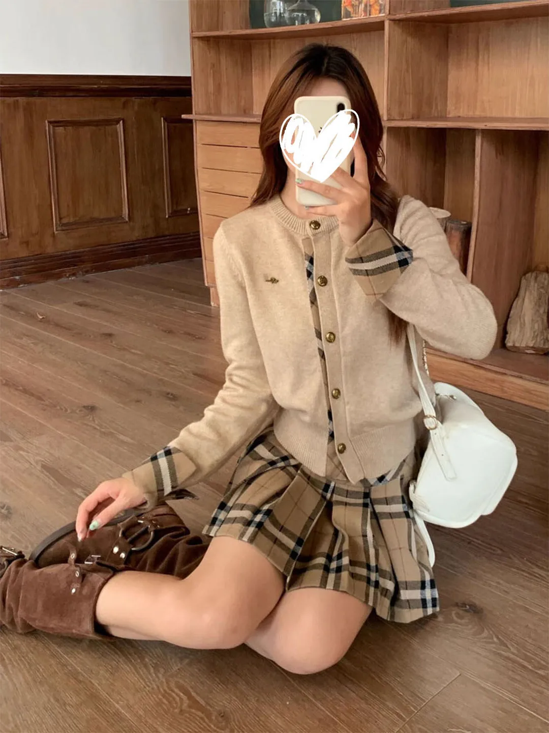 レディースニットセーターとプリーツミニスカートセット、ラウンドネック、長袖、ストライプデザイン、秋冬ファッションアンサンブル - TopDealBox