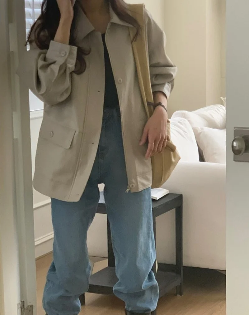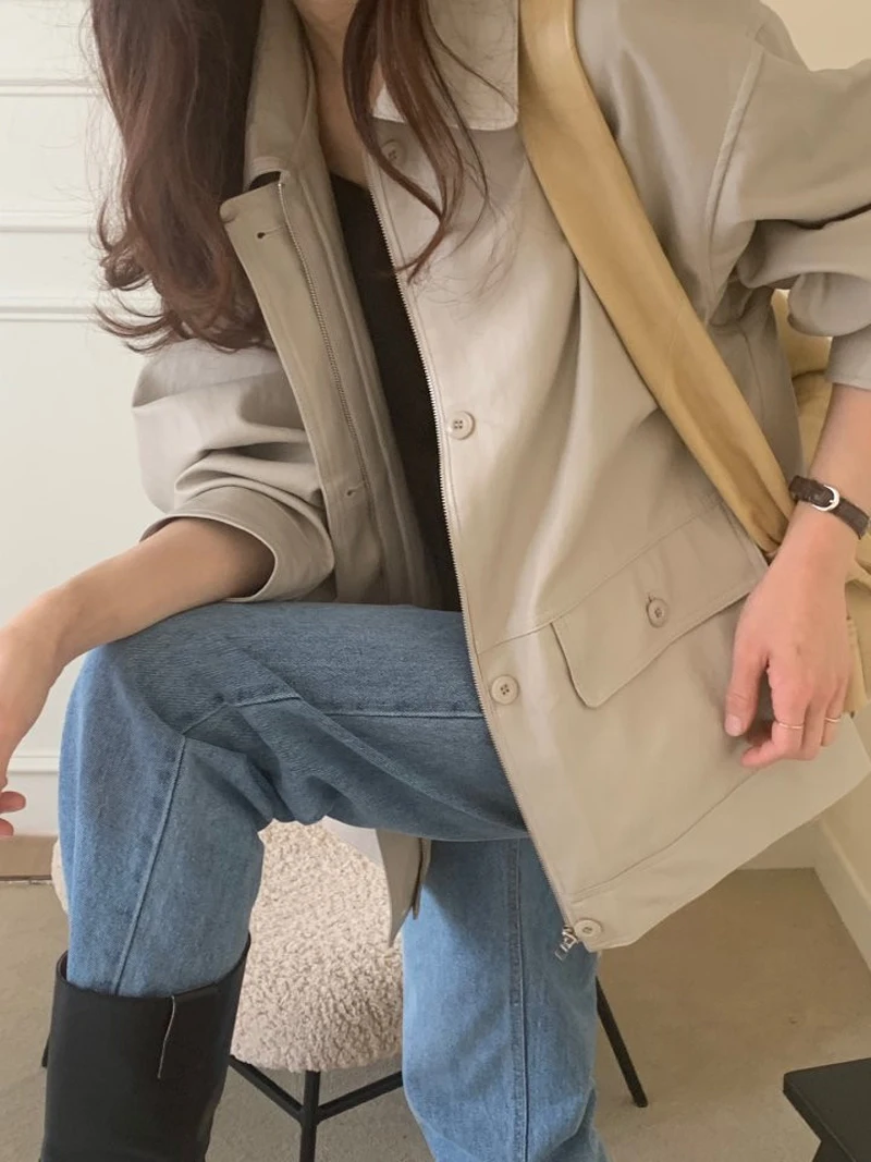 カジュアルジッパーポケットカラーレザージャケットアウター長袖ルーズフィットその他素材100%秋シーズンレディースレザーコート - TopDealBox