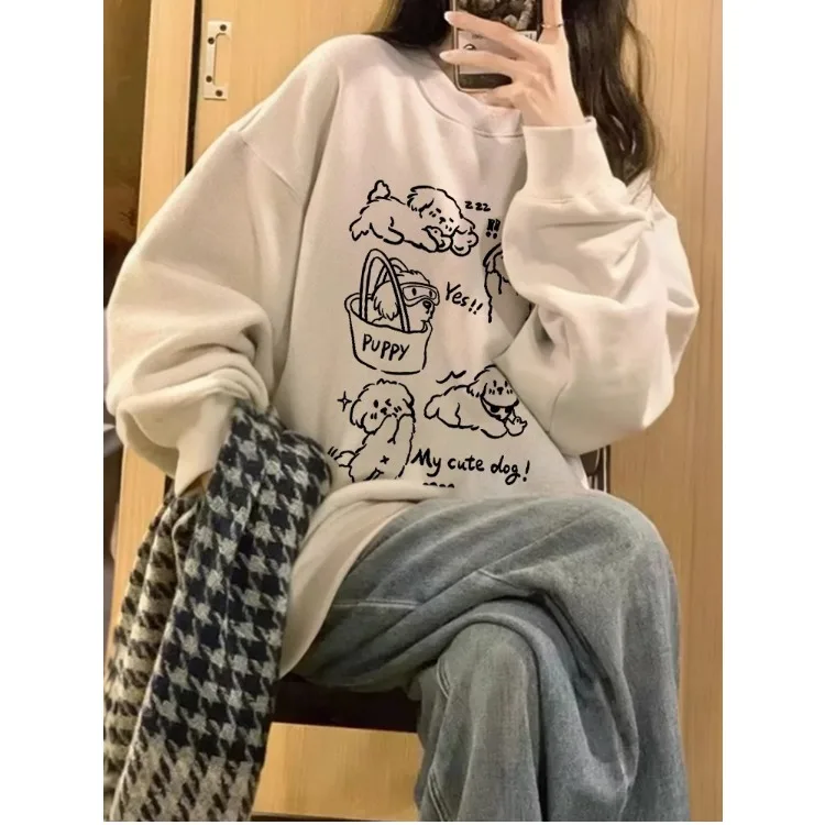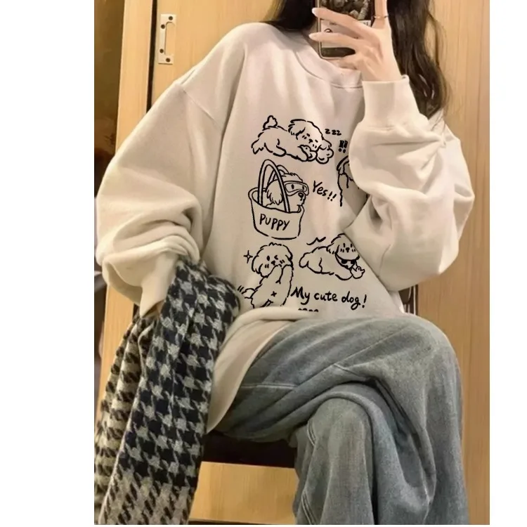 アメリカンレトロライン犬プリントルーズフィットラウンドネックトレーナー女性のスタイル多用途痩身効果綿 100% 冬着用 - TopDealBox