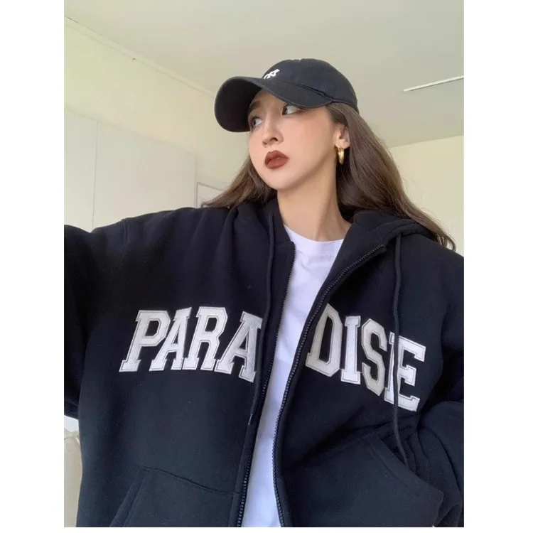 レトロアメリカンフリース裏地パーカー女性の二層ジッパーカーディガンレタープリントスウェットシャツ綿 100% 冬 2024 - TopDealBox