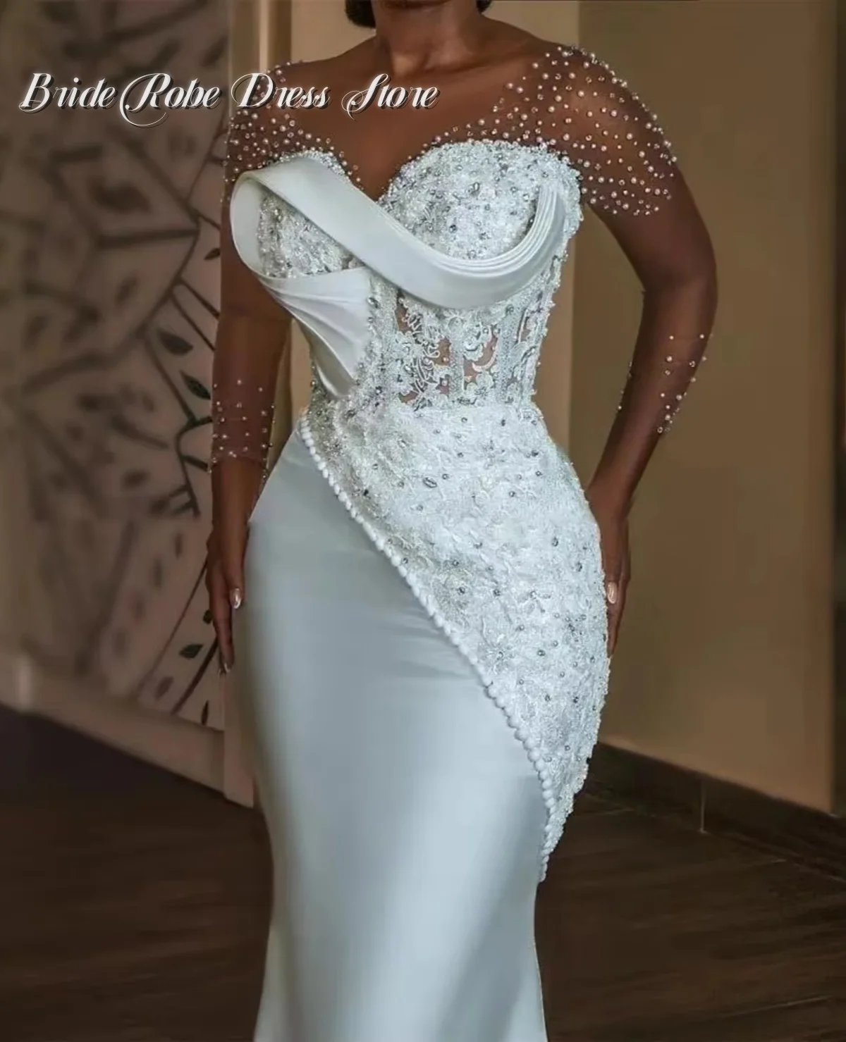 女性のためのマーメイドウェディングドレス,アプライク,ビーズ,プリーツ,ウェディングドレス,透明な襟,長袖,2020 - TopDealBox