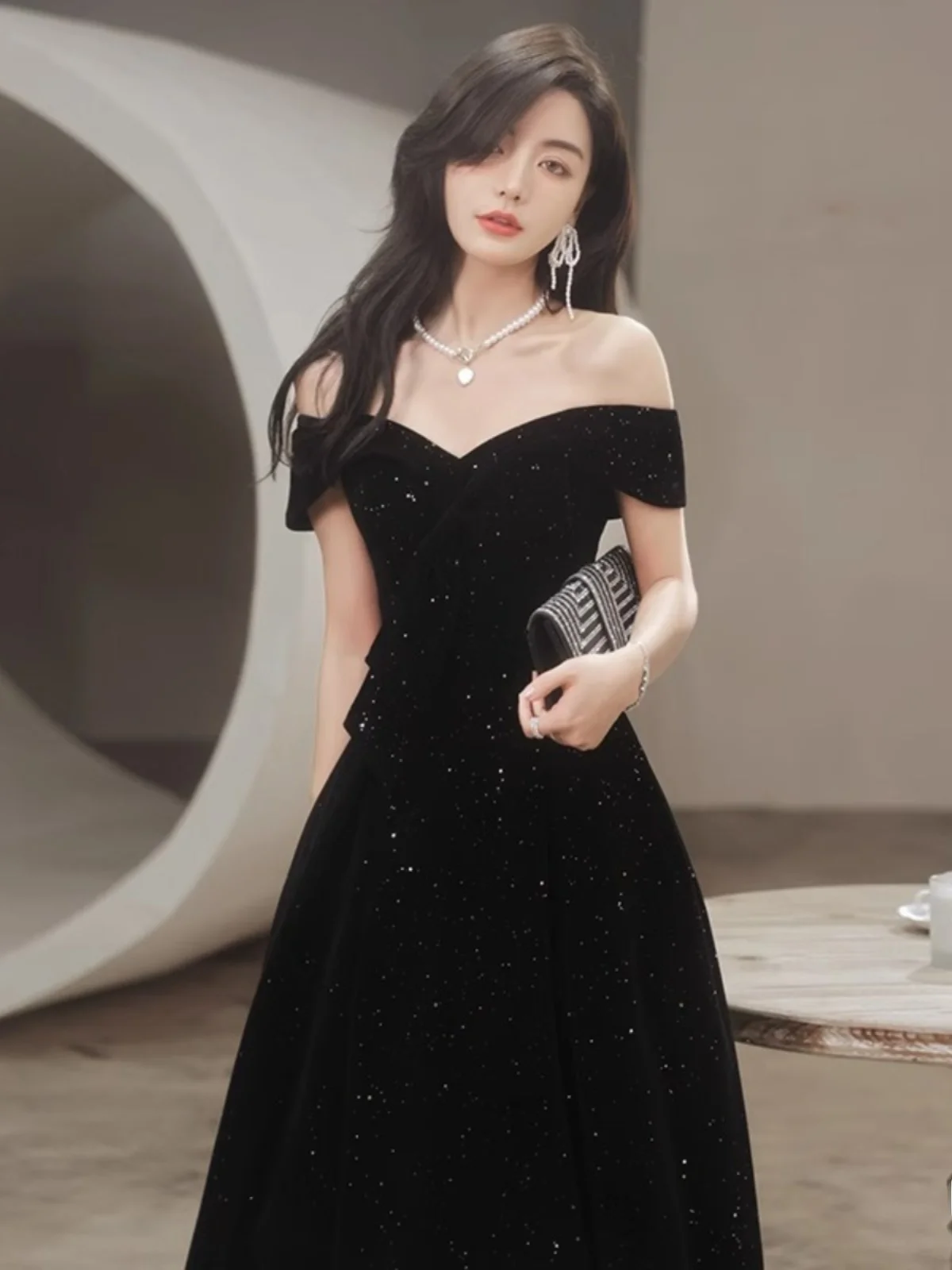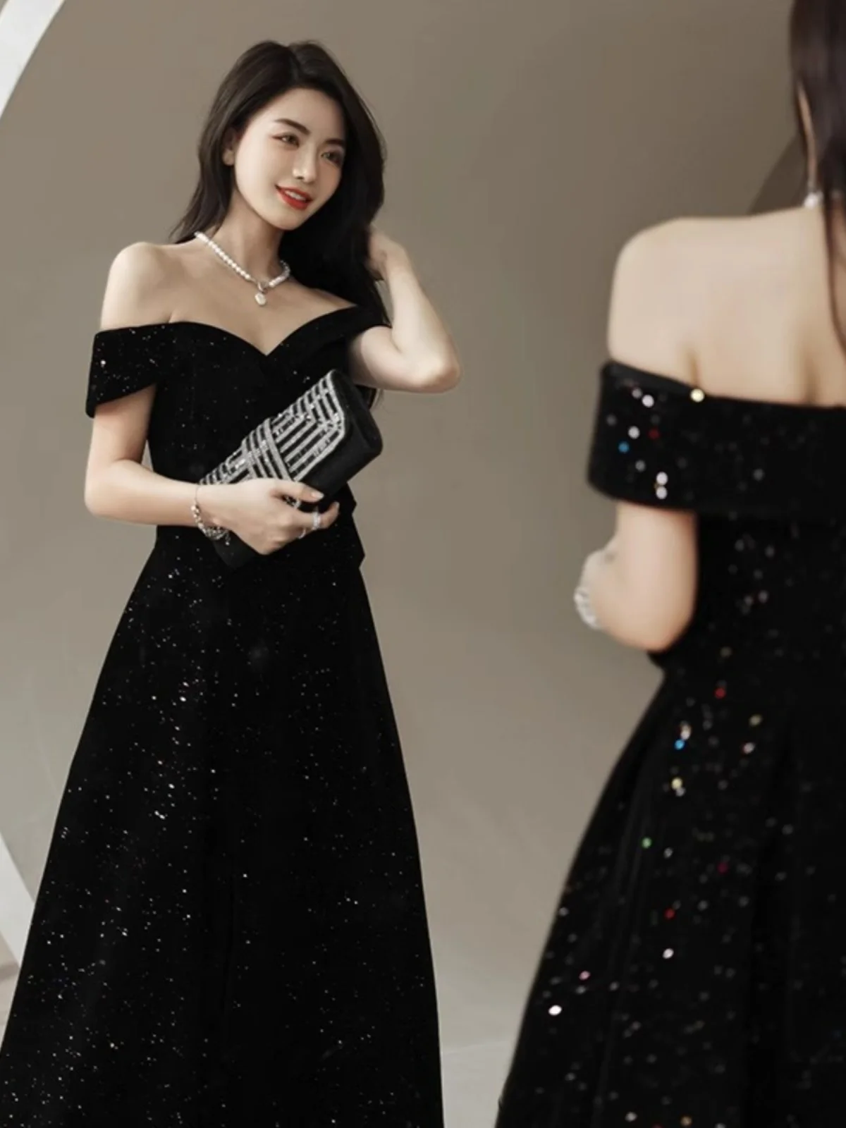 2024 新ベルベットワンショルダーブラックイブニングドレスロングボールガウンホステスフォーマルウェア冬エレガントなスタイル韓国語バージョン - TopDealBox