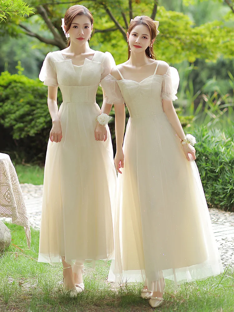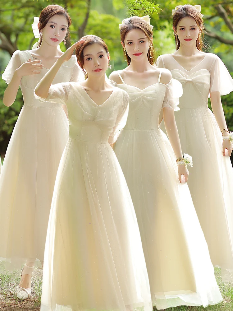 甘いロングメイドオブオナードレス 2024 新スタイルエレガントな姉妹グループコーラスウェディングドレス半袖プリーツボールガウン - TopDealBox
