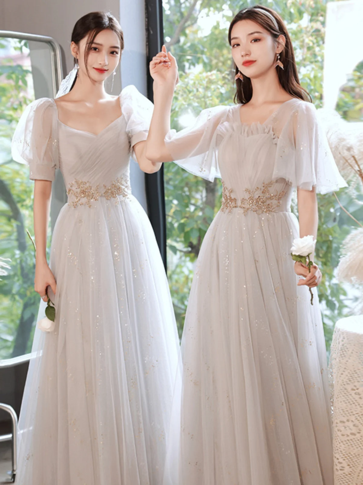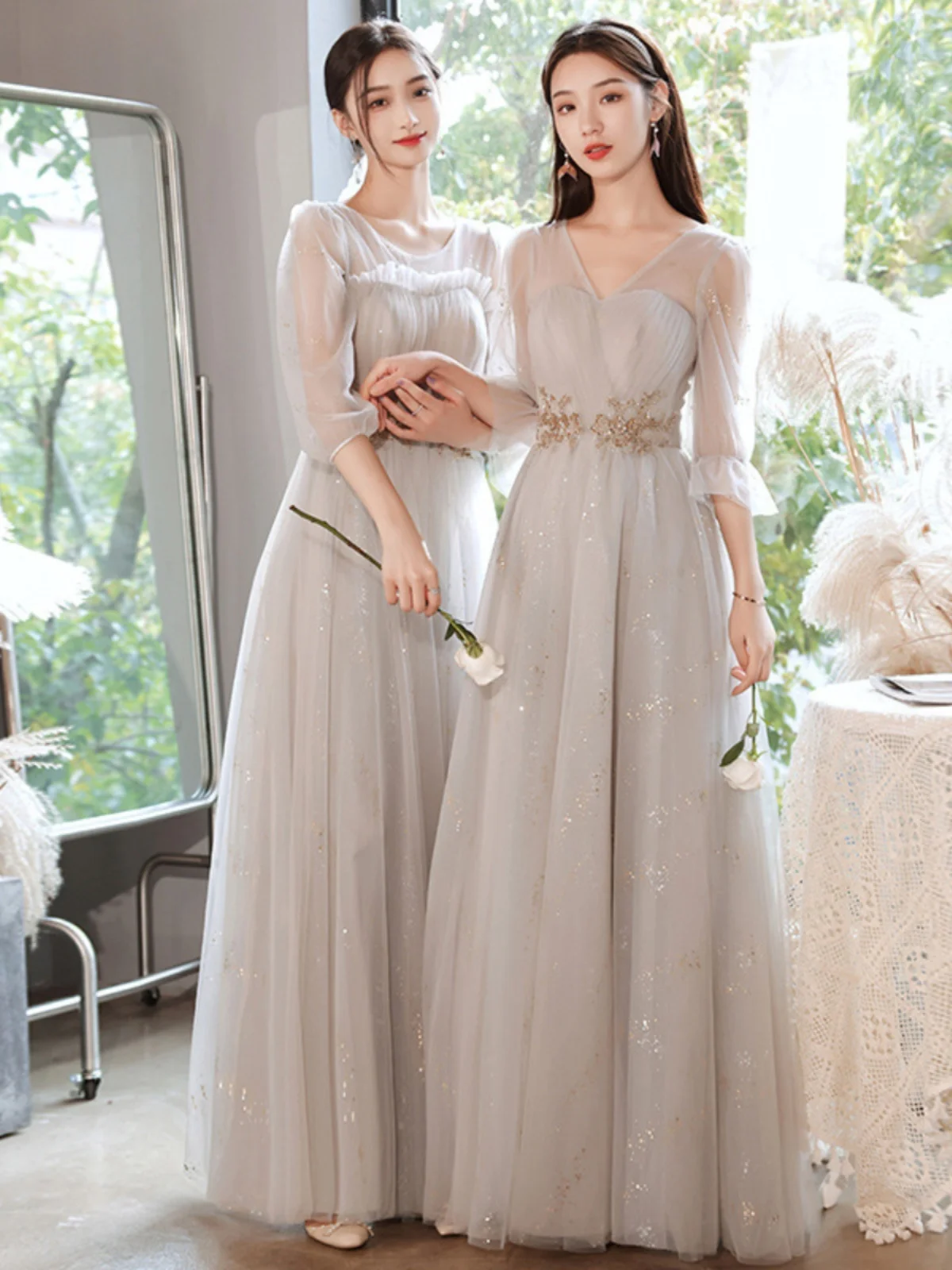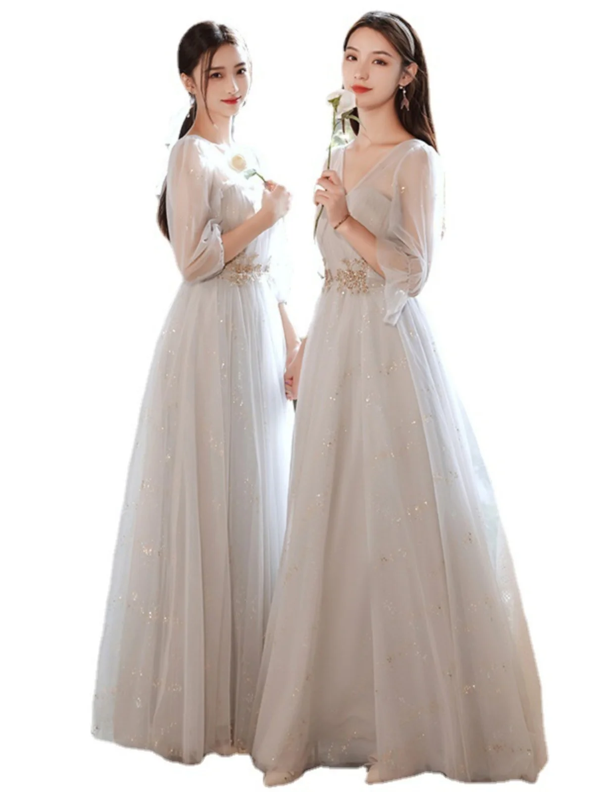 グレーロングウエディングドレス 2024 新スタイルメイド制服エレガントな学生卒業式妖精結婚式姉妹グループ衣装 - TopDealBox