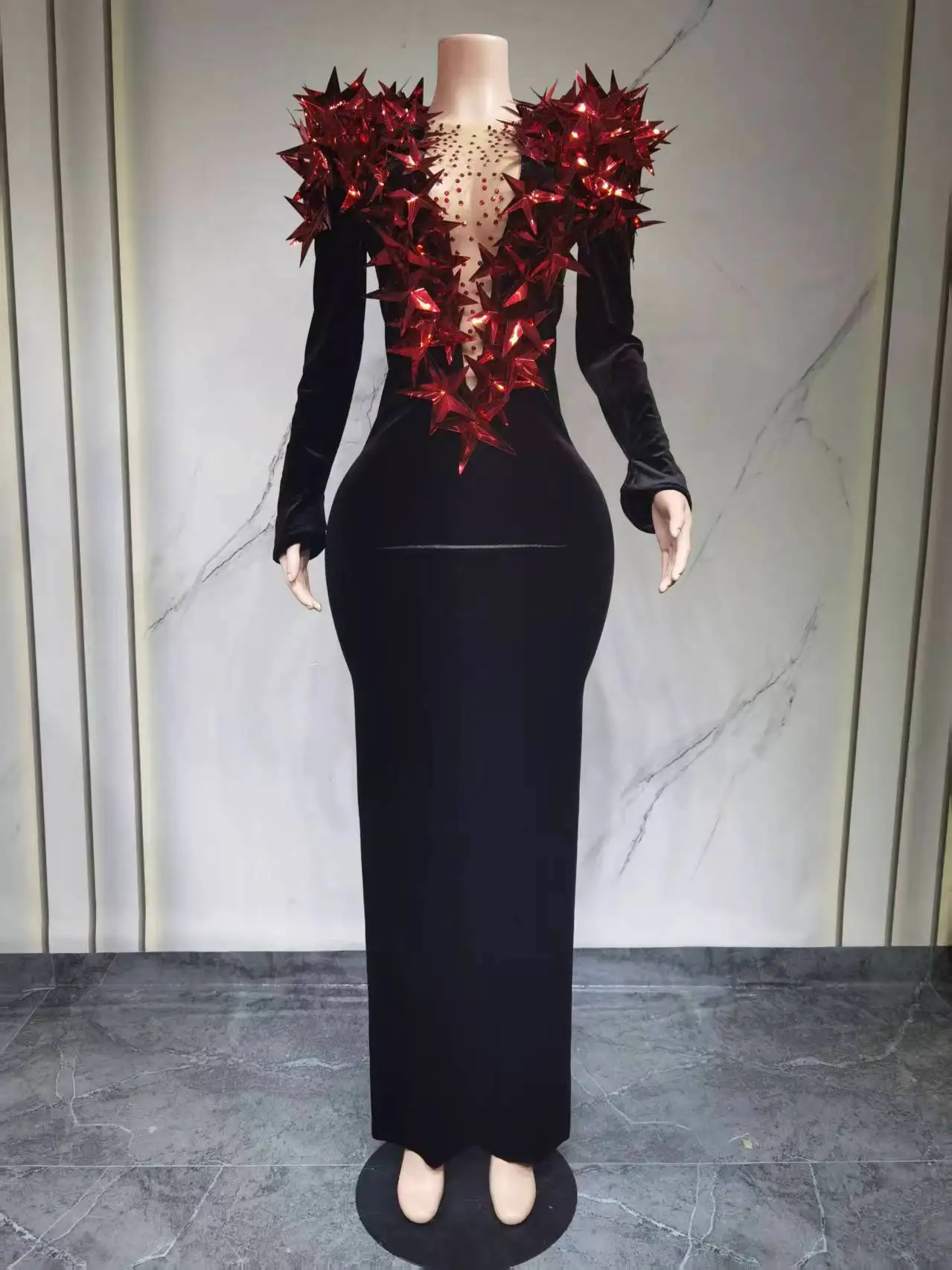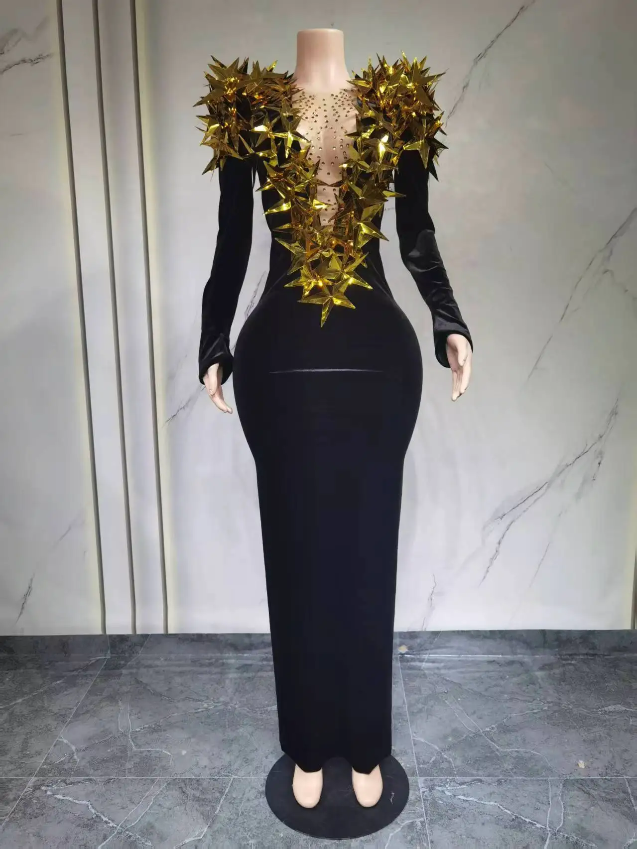 2025年新作 シャイニーブラック ラインストーン ベルベット 長袖 ボディスーツ レディース イブニングパーティー クラブ ガラ ホスト ナイトクラブ バー ステージ衣装