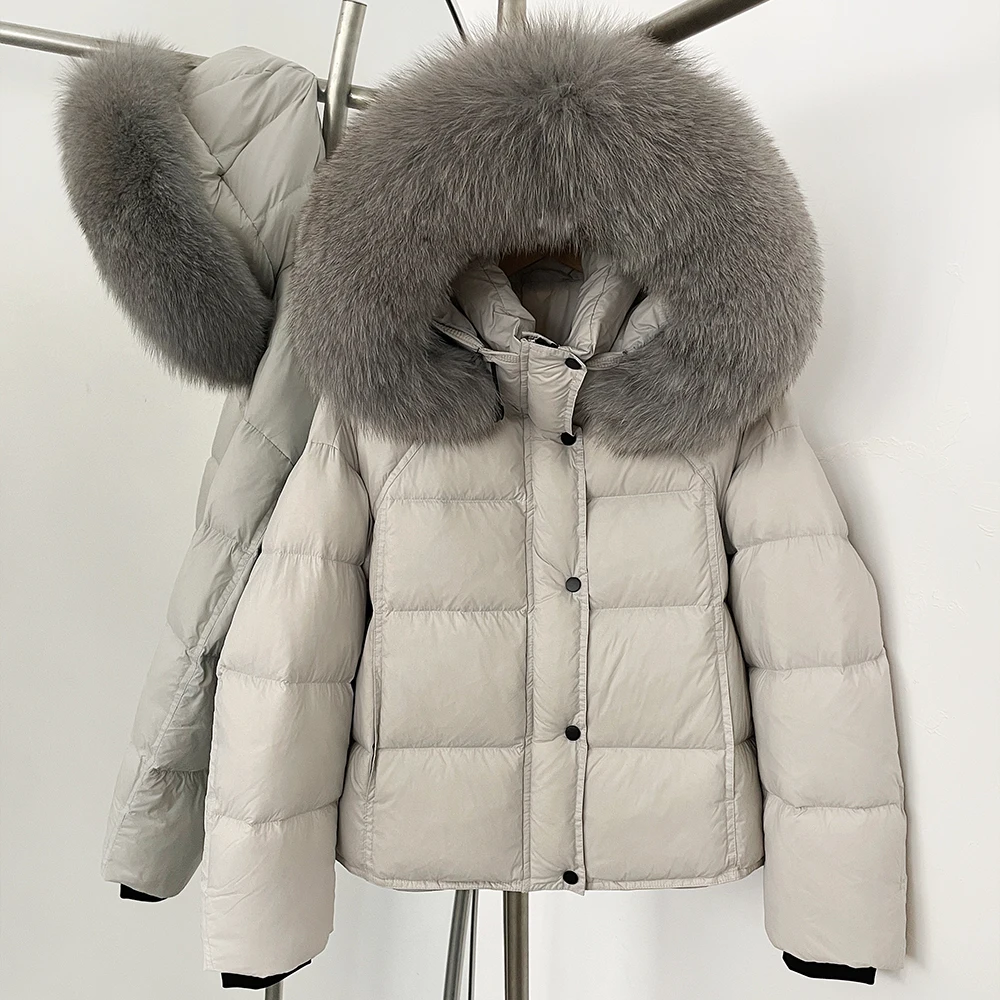ホワイトダックダウンコート 2025年秋冬新作トップス レディース ニット暖かいふわふわパファージャケット 女性用フード付きリアルフォックスファーコート - TopDealBox