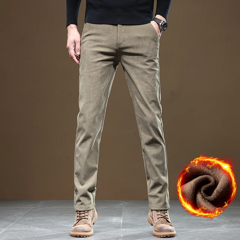 2025年新作 冬用フリース裏地付きコーデュロイパンツ メンズ ビジネスファッション スリムフィット ストレッチ 厚手 グレー カーキ 起毛 カジュアルパンツ 男性用 - TopDealBox