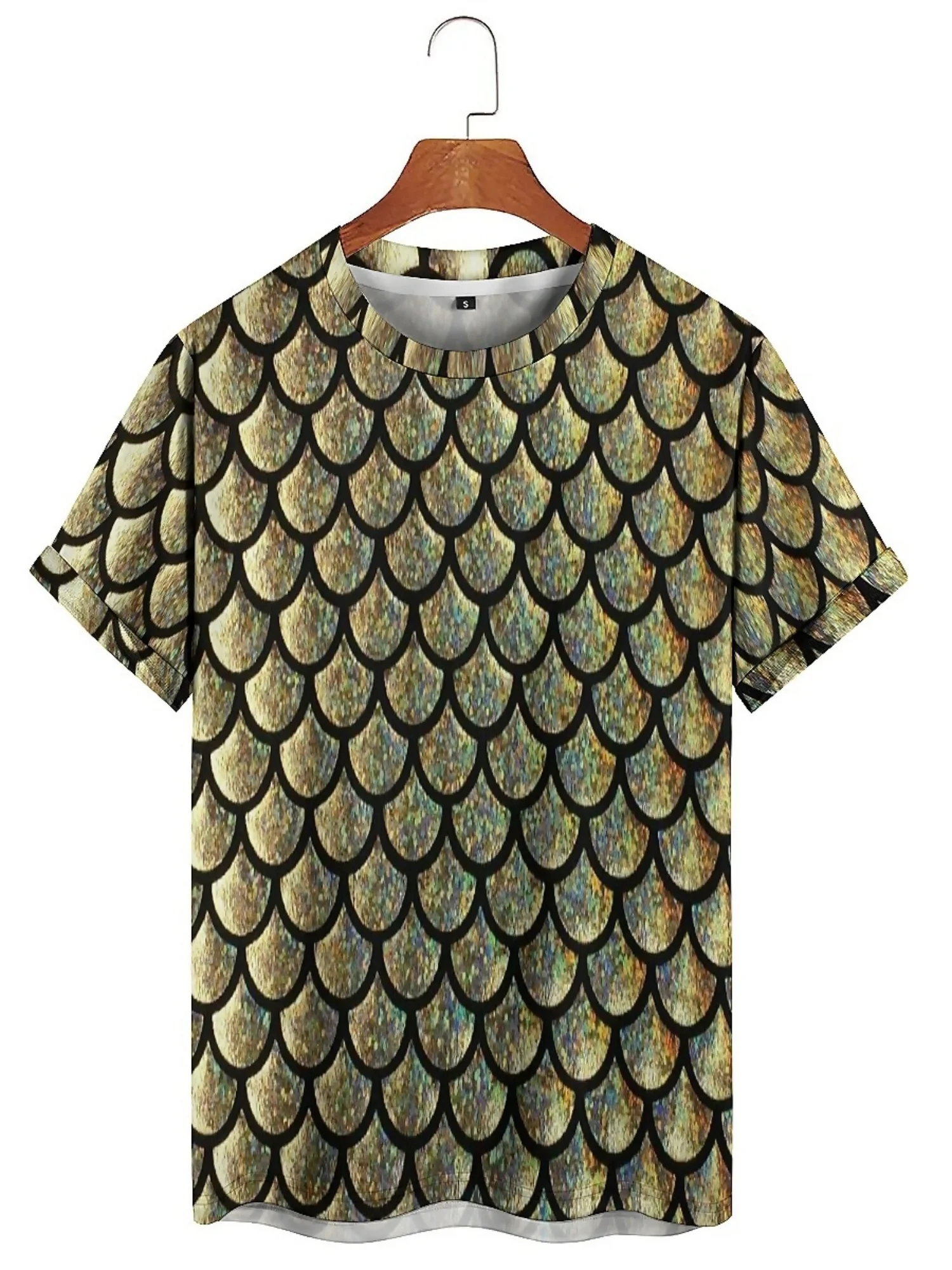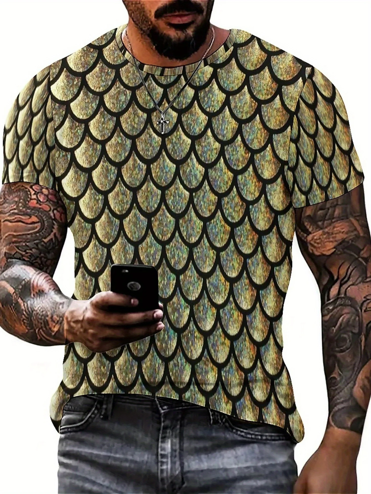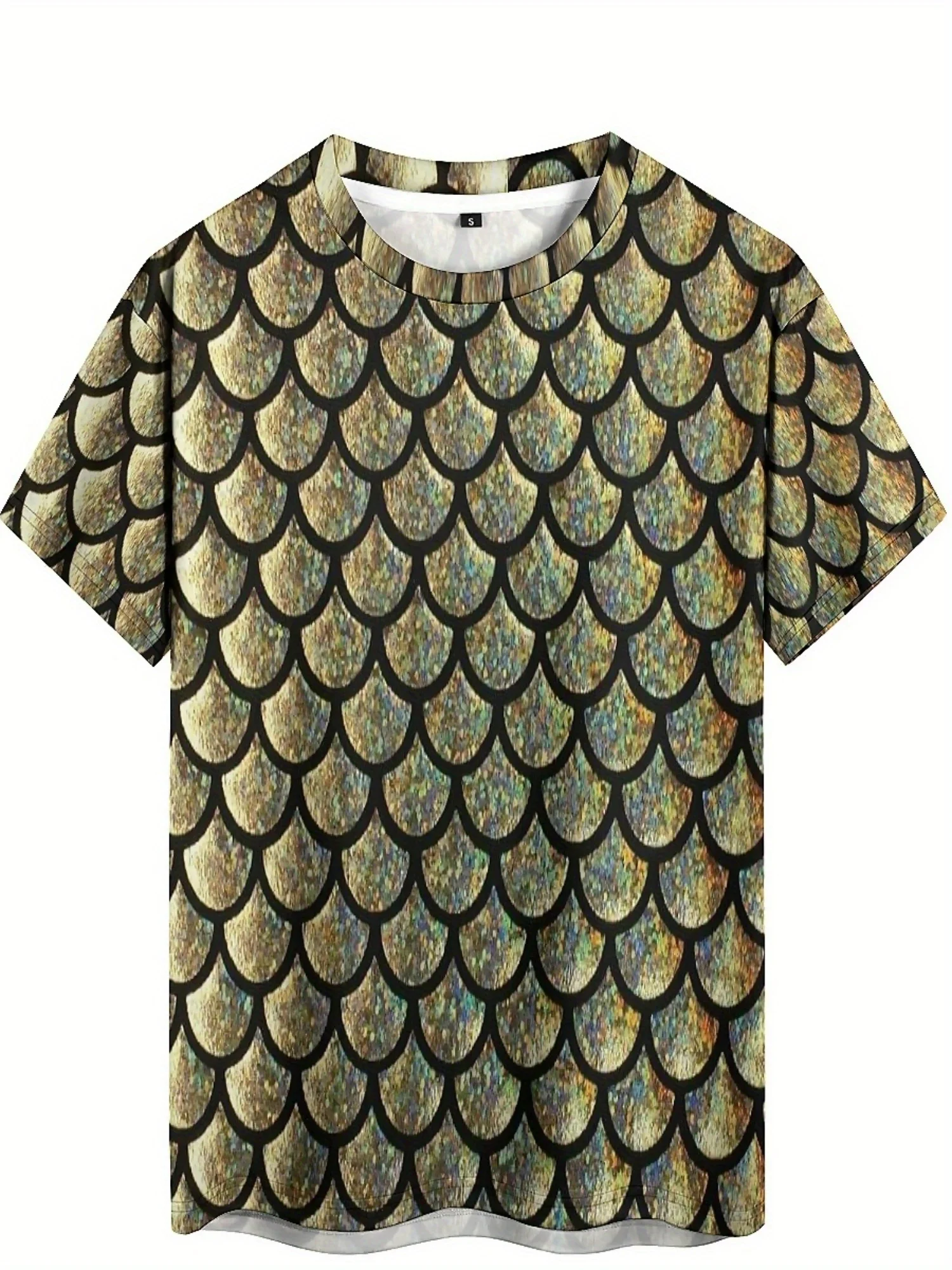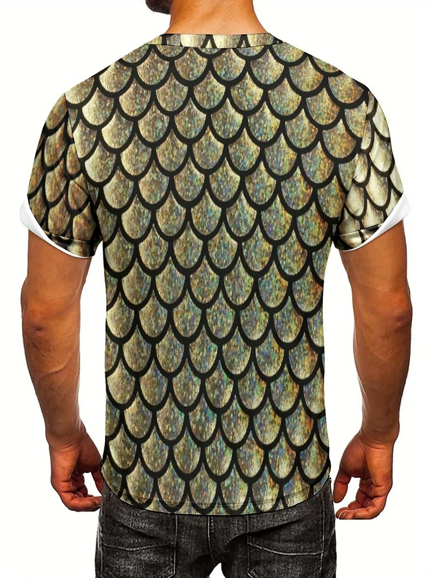 メンズ ヒップホップ スタイル 3D 幾何学的な魚の鱗プリント T シャツ、半袖、通気性のあるポリエステル生地、グリーン/ゴールデン スケール デザイン - TopDealBox