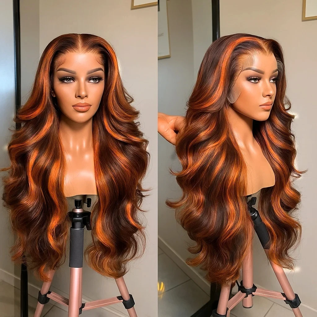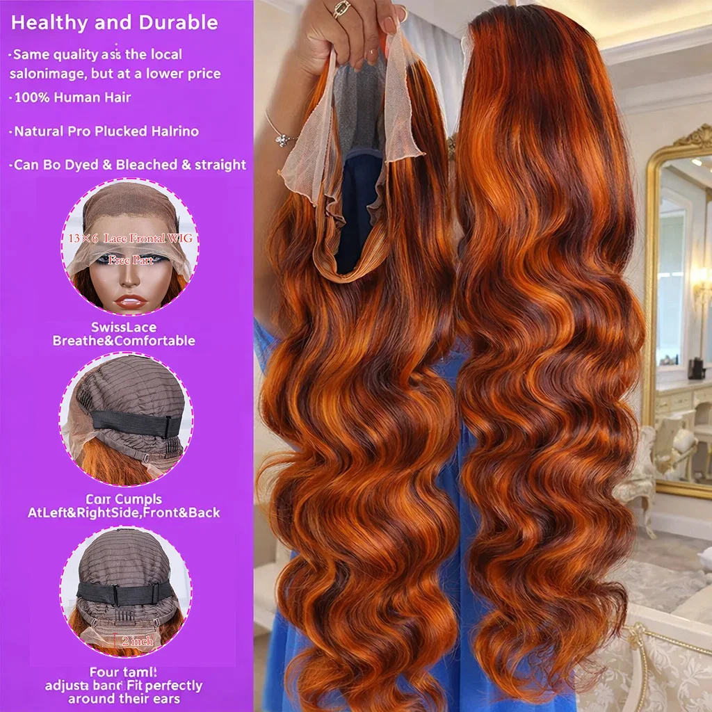 4/350 ハイライトオンブレボディウェーブウィッグ 13x6 レースフロント人毛ウィッグ ジンジャーオレンジブラウンカラー ウォーターウェーブ 13x4 レースフロントウィッグ - TopDealBox