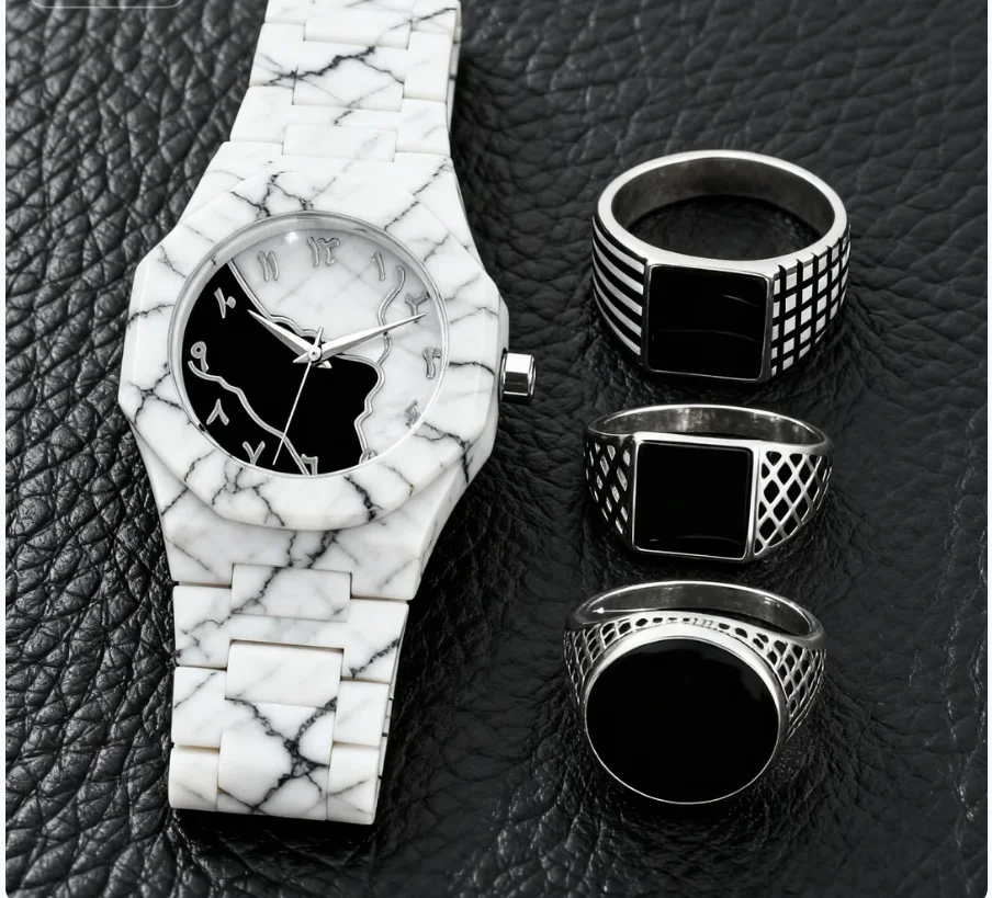 5ピースビジネススタイルの組み合わせ - 濃い革の背景に金色の時計と指輪をエレガントに配置し、豪華さを際立たせています。 - TopDealBox