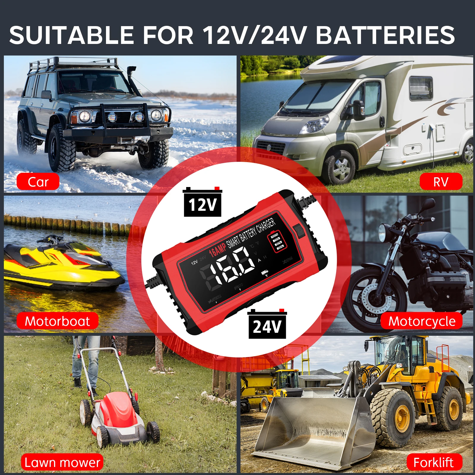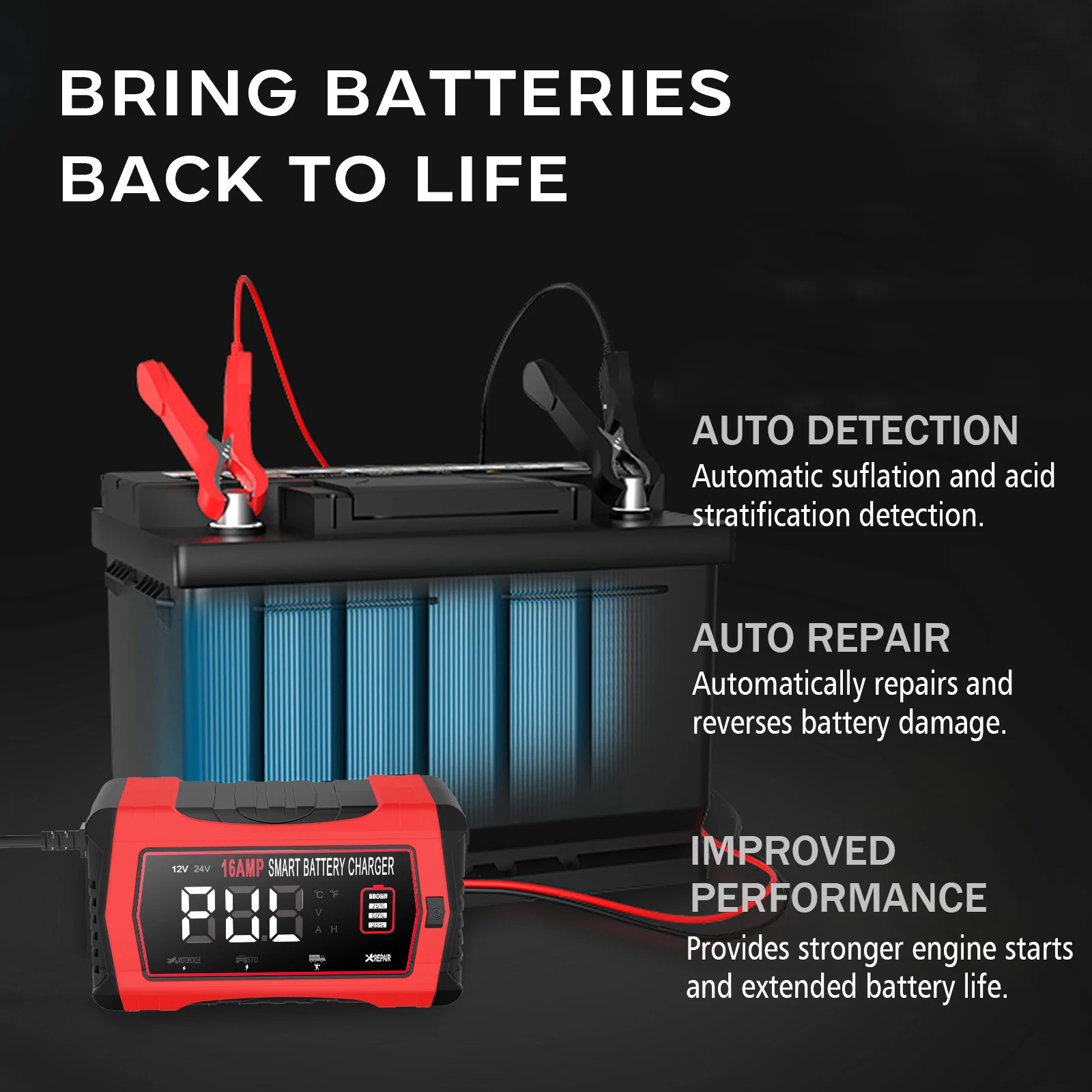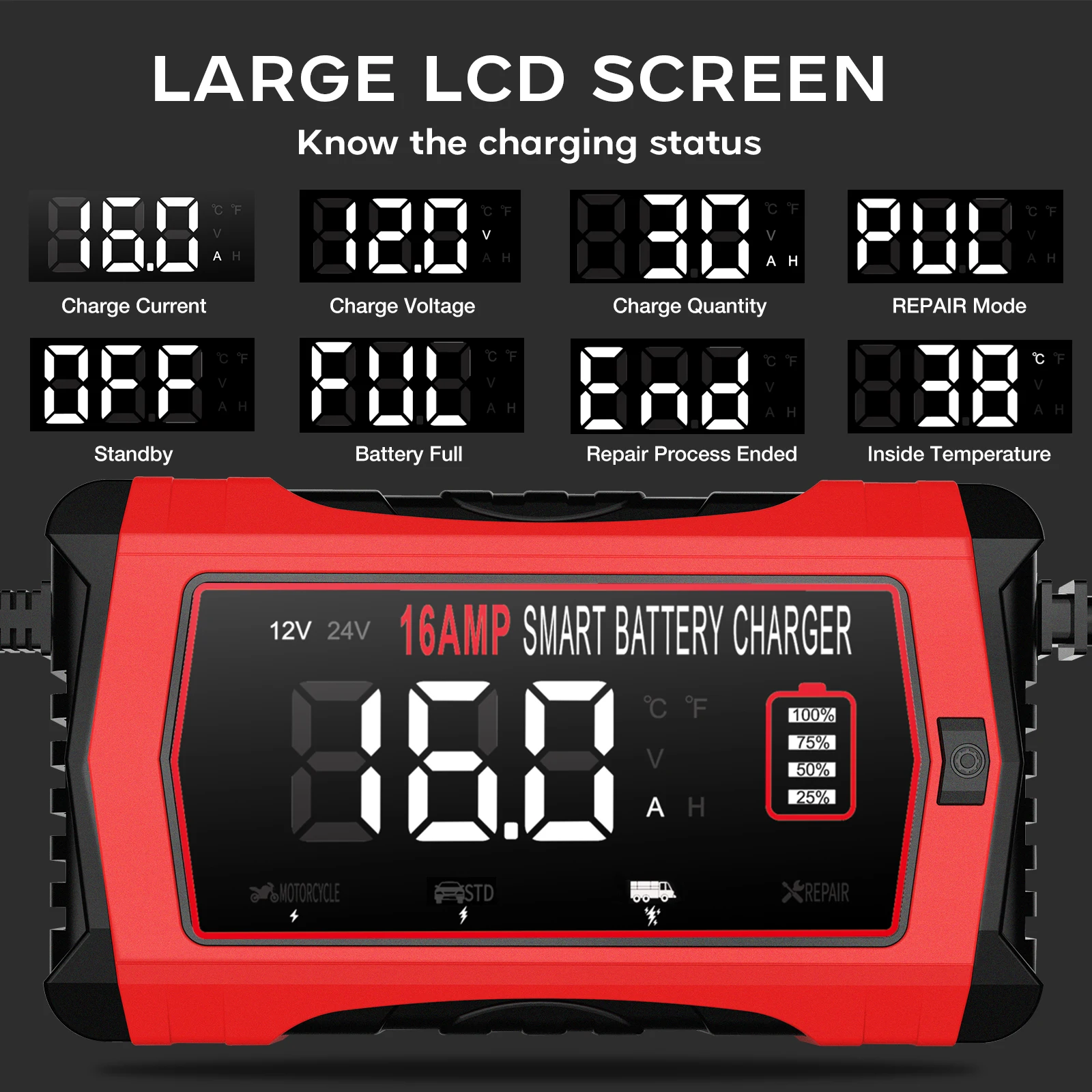 6V 12V 24V 16A ユニバーサル修理用カーバッテリー充電器、鉛蓄電池、AGM、GEL、LiFePO4バッテリー対応のインテリジェント修理機能付きバイク充電器 - TopDealBox