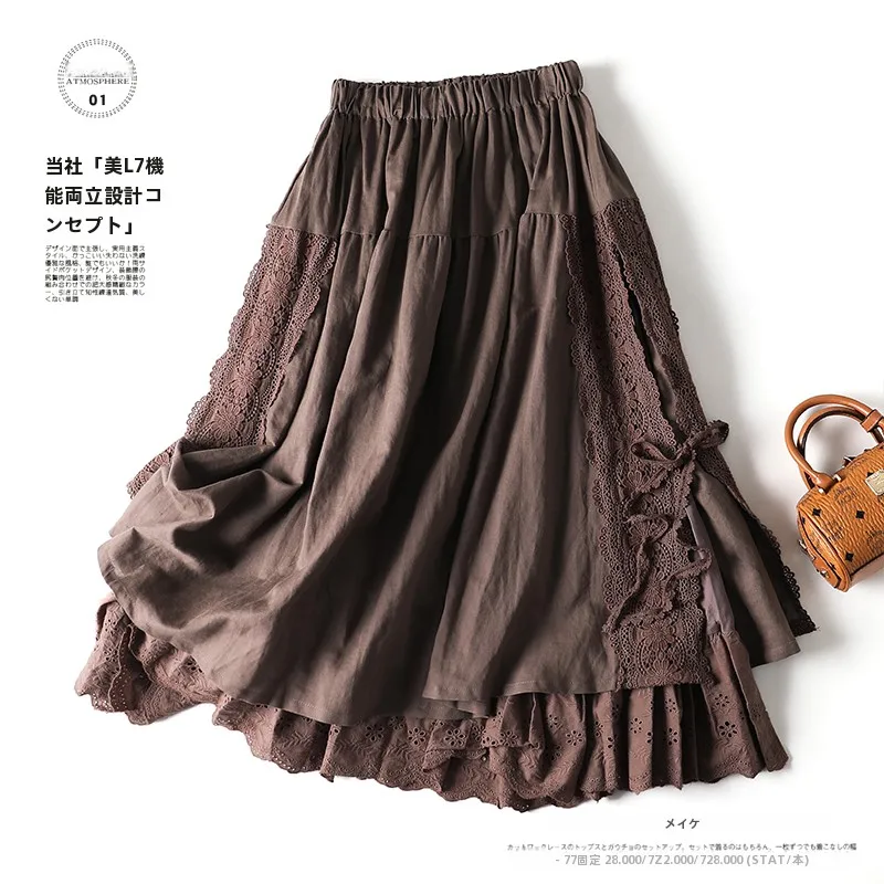 甘い刺繍リネンスカート ベルト付き ヘビーワーク ウエストゴム Aライン ロングスカート ハイウエスト 通勤スタイル 芸術的トレンド - TopDealBox