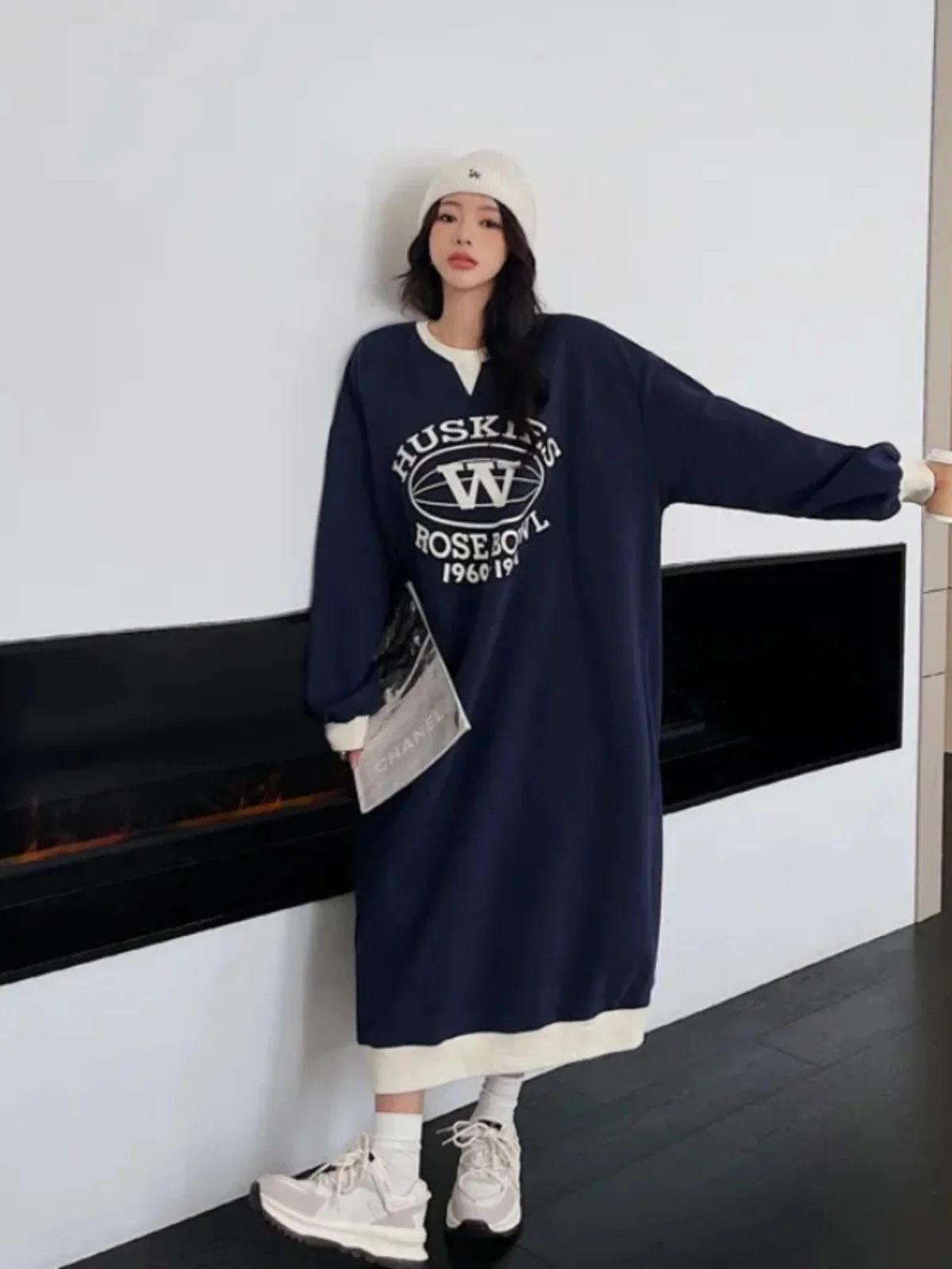 プラスサイズ韓国風ルーズカジュアルスウェットシャツドレス、お腹を隠すスリムミドル丈Aラインワンピース、リンゴ体型の女性向け - TopDealBox