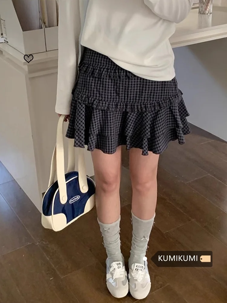 ハイウエストチェック柄ミニスカート、木目調エッジケーキスタイルAラインスカート、レディース秋物カジュアル、ポリエステル素材 - TopDealBox