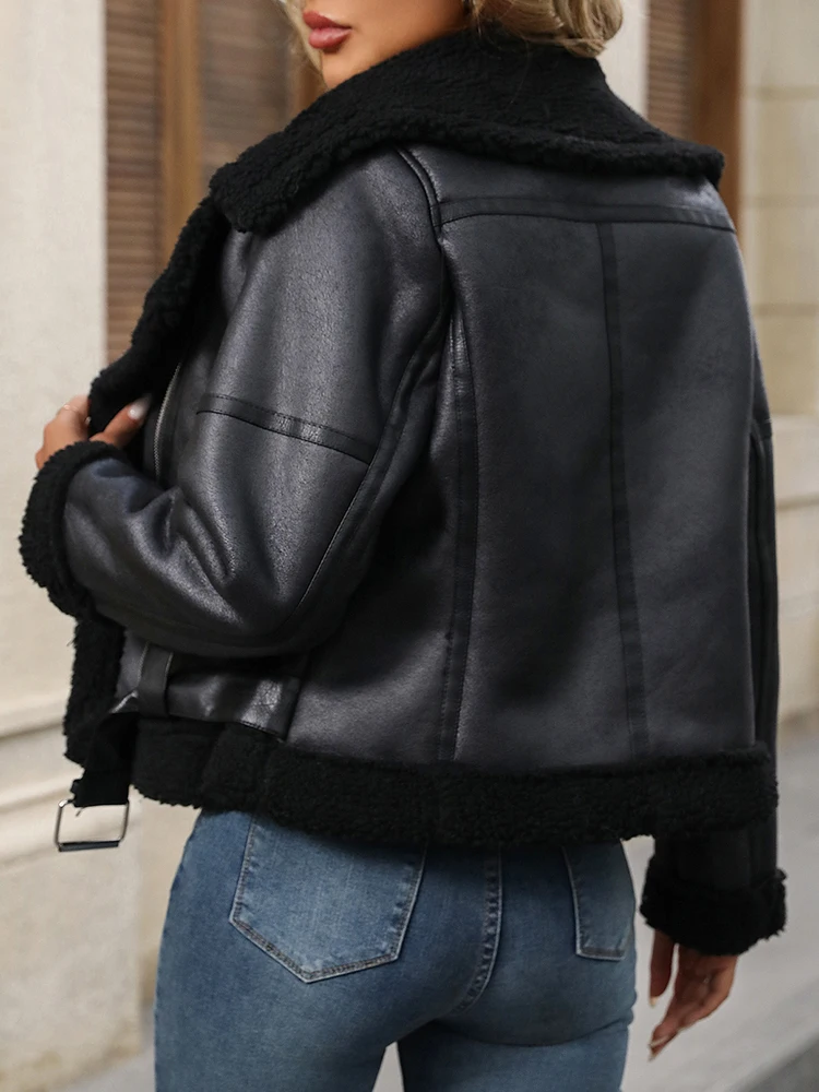 Ailegogo 新しい女性秋冬暖かい黒フェイクラムファーレザージャケットストリート女性のレトロなジッパーベルトコート生き抜く - TopDealBox