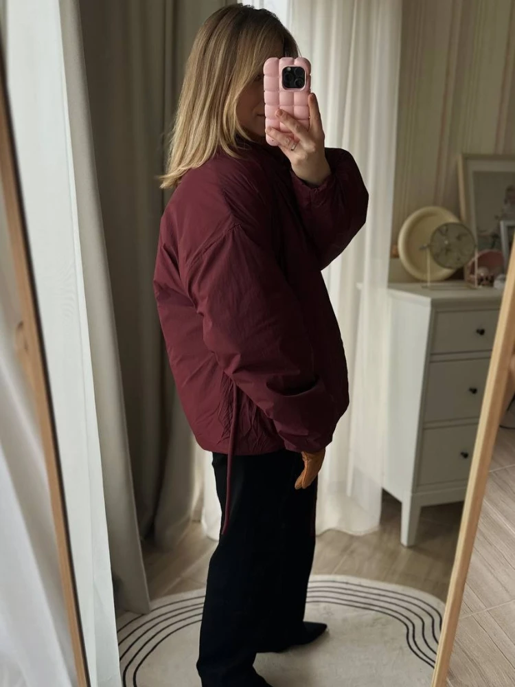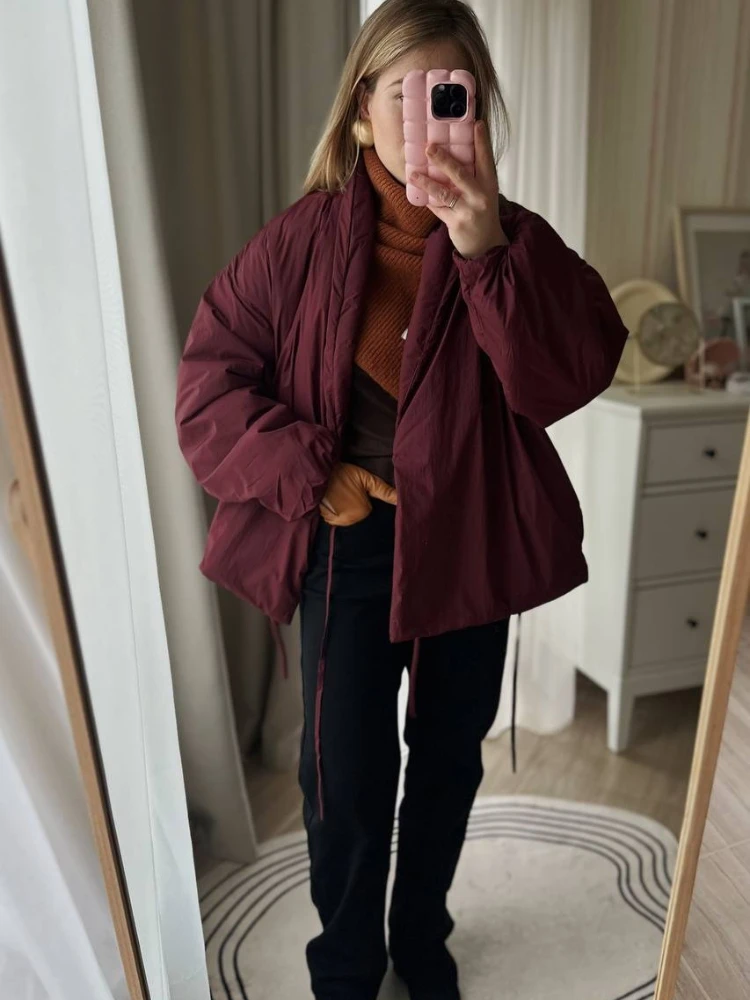 AOMO 2026 春の女性ワインレッドオーバーサイズラップパーカーボウ女性ハイストリートパッド入りキルティングジャケット BE220 - TopDealBox
