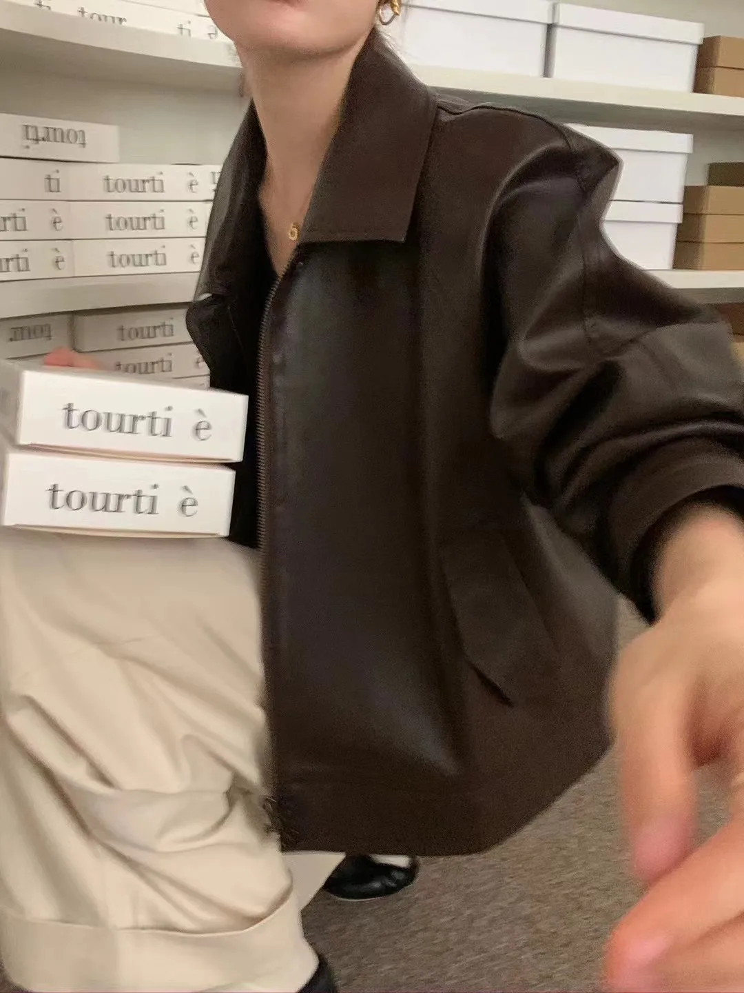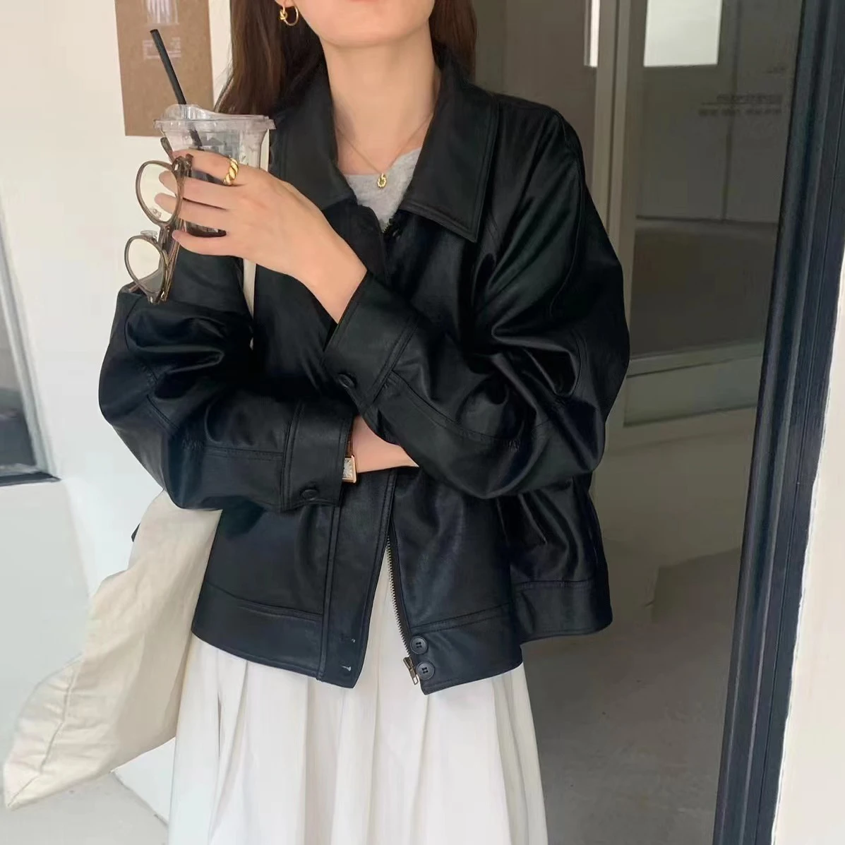 レトロスタイリッシュなスタンドカラージッパーポケットルーズ多用途 BF スタイルオートバイジャケットレザーコートアウター女性のための - TopDealBox