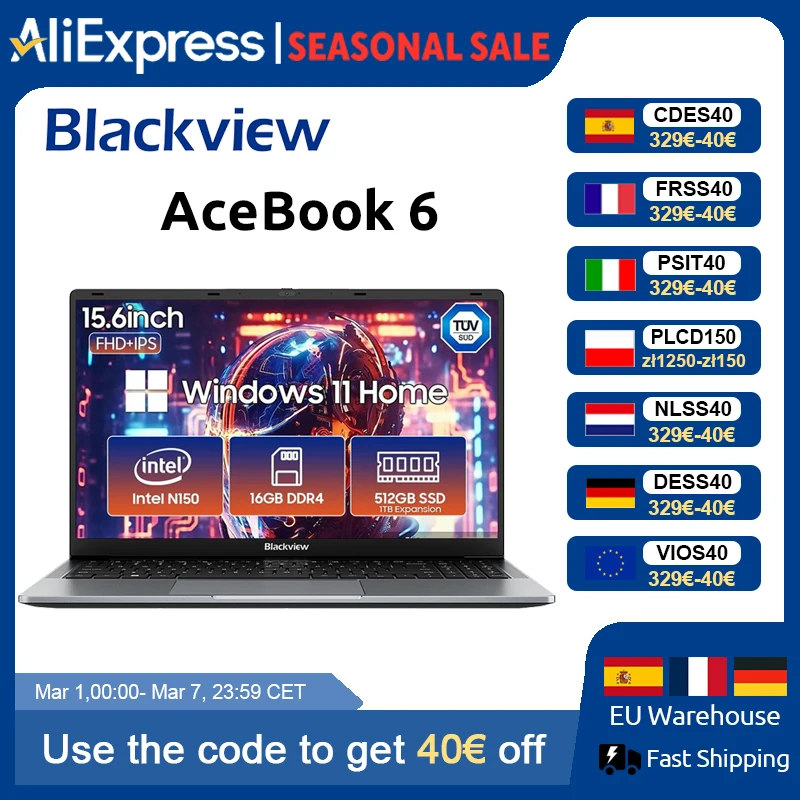 ♡Vista rápidaBlackview AceBook 6 Laptop 15.6" FHD IPS Intel Twin Lake N150 16GB RAM 512GB SSD + expansión hasta 1TB Windows 11 Home Notebook347.10 EUREUR 1074.63Destacado★★★★★★4.7