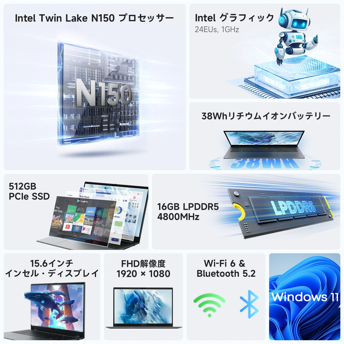 ↑CHUWI GemiBook Plus ノートパソコン 15.6インチ 512GB SSD 16GB LPDDR5 IntelN150(最大3.6GHz)Windows 11 ワークノートパソコン IPS FHDスクリーン - TopDealBoxChuwi-Mini Book xラップトップ,2 in 1, Intel n100,n5100,10.51インチ,fhd,ips画面,12gb,lpddr5,512g ssd,Windows 11ノートブック,1200x1920 Firebat-軽量ビジネスコンピューター,a16ラップトップ,16インチcpu,n5095,n100,16GB RAM,ssd,512GB, 1テラバイト,bt4.2,wif5,lpddr4
