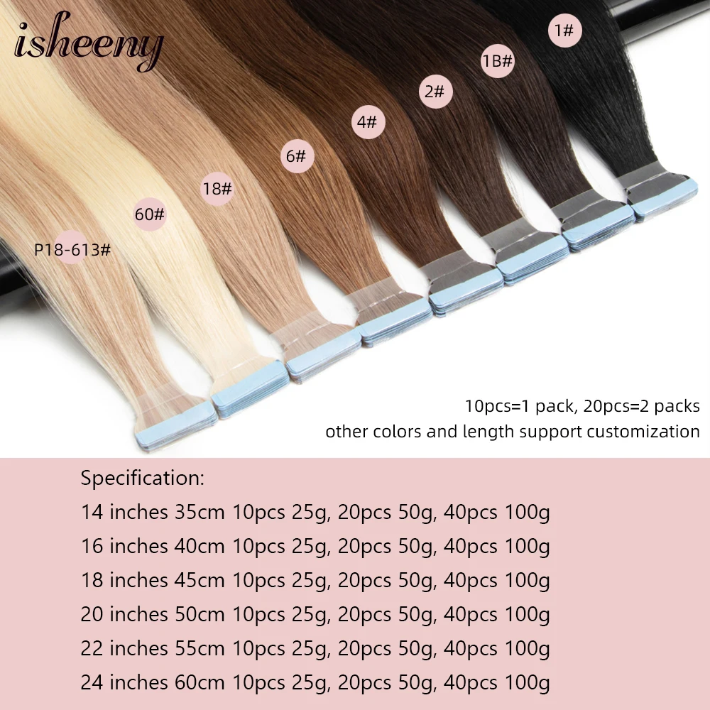 ISHEENY-天然の人間の髪の毛の延長テープ,ヨーロッパのヘアエクステンション,黒と茶色のpuのよこ糸,14 "-24" - TopDealBox
