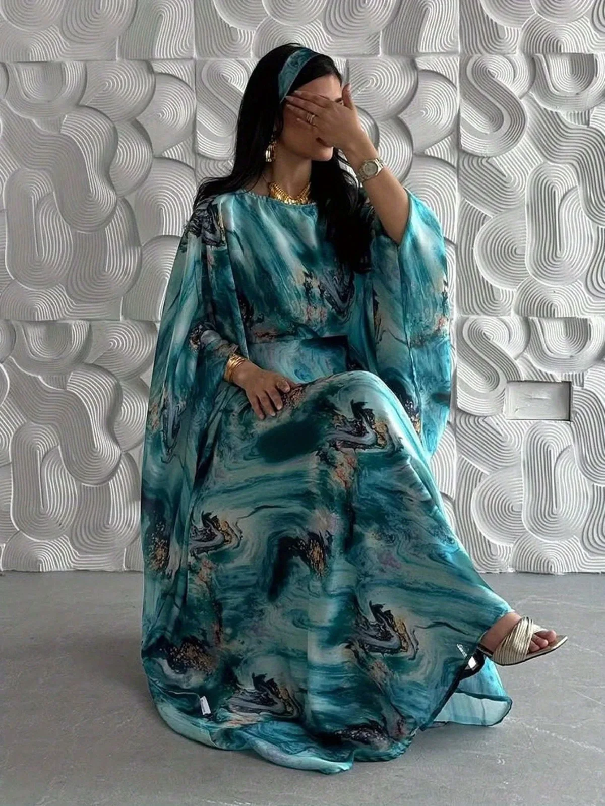 中東プルオーバーアバヤフルスリーブルーズイブニングドレスエレガントなカフタン女性 Jilbabs イスラムプリントマキシドレス - TopDealBox