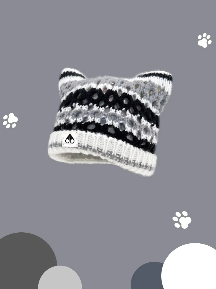 Moose Kingship レディース ニット帽 猫耳デザイン 中空暖かさ 秋と冬シーズン用 カラフルなストライプ ドポミンスタイル - TopDealBox