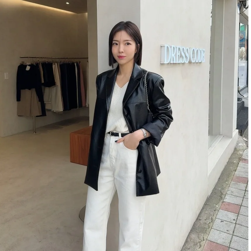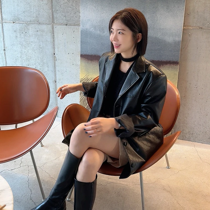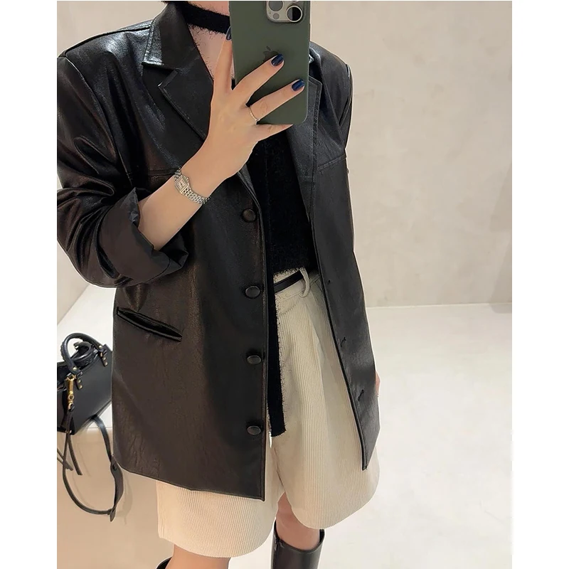 シックな韓国スタイル長袖 Pu レザージャケット女性のカジュアル多用途シングルボタンルーズフィット秋のアウター - TopDealBox