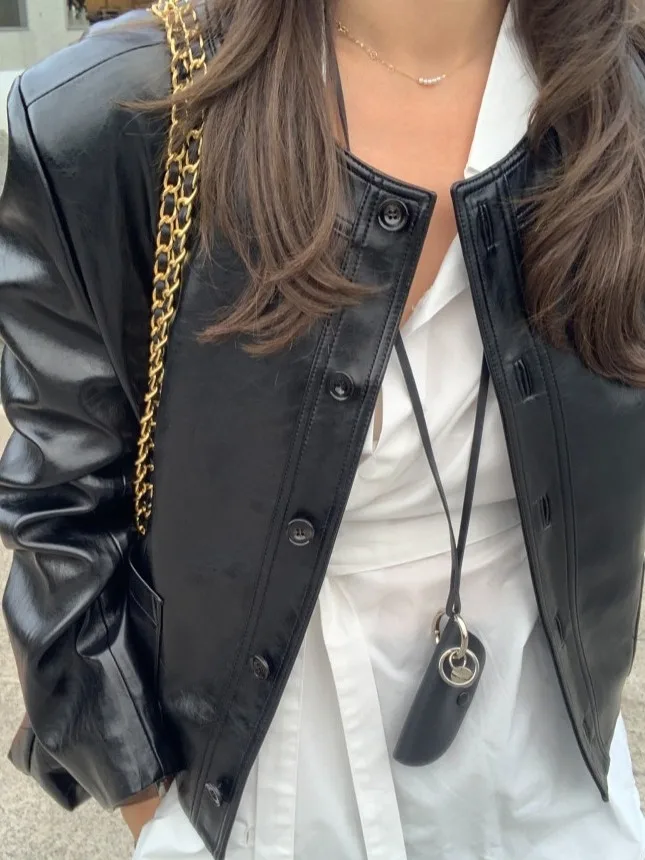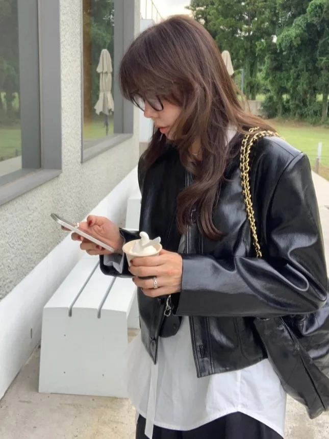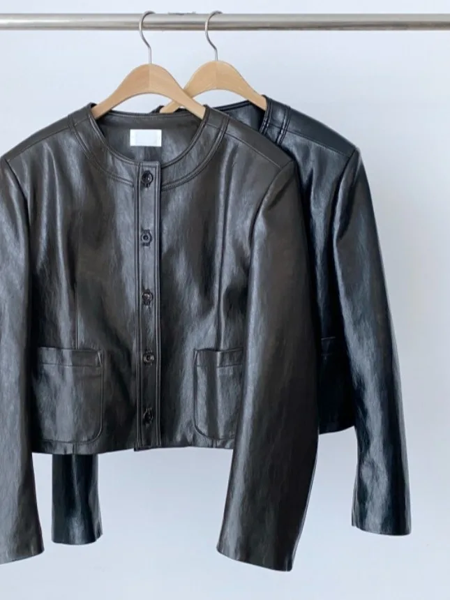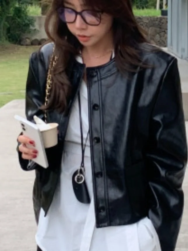 レトロブラックラウンドネックレザージャケット女性のショートオートバイスタイル Pu レザーコート秋冬小型トレンディな新モデル - TopDealBox