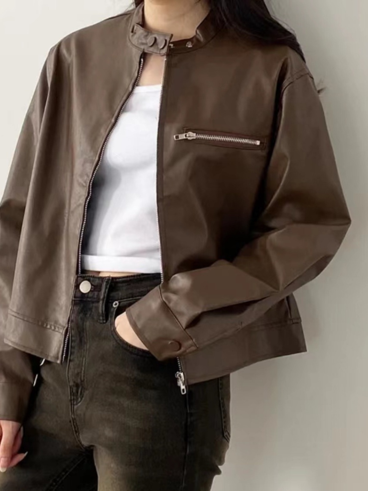 ブラック Pu レザージャケット女性の韓国スタイルヴィンテージラウンドネックジッパールーズ長袖トップ通勤ファッション 18-24 歳