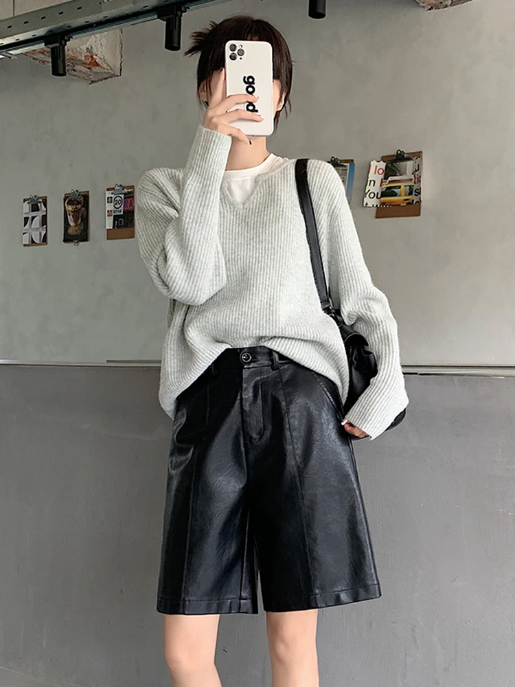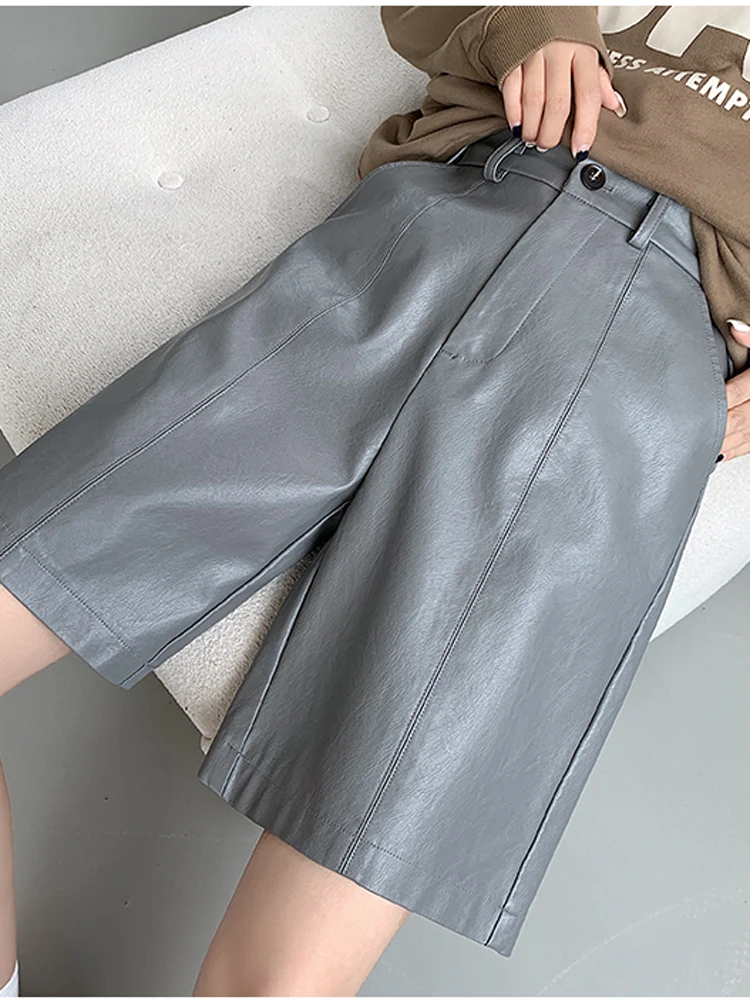 ハイウエスト Pu レザーミニショーツ女性の秋冬ルーズストレートレッグ A ラインワイドレッグパンツ通勤韓国スタイル - TopDealBox