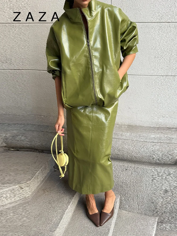 PUレザージャケットとスカートのセット、スタンドカラーのルーズコート、ローウエストの無地ロングスカート、秋用コートとスカートのセット、2025年新作レディースファッション - TopDealBox