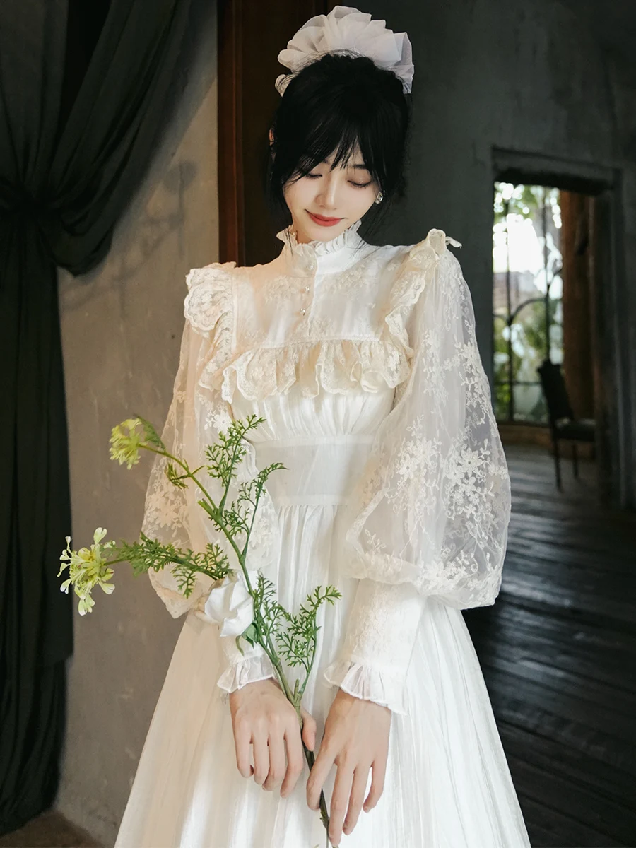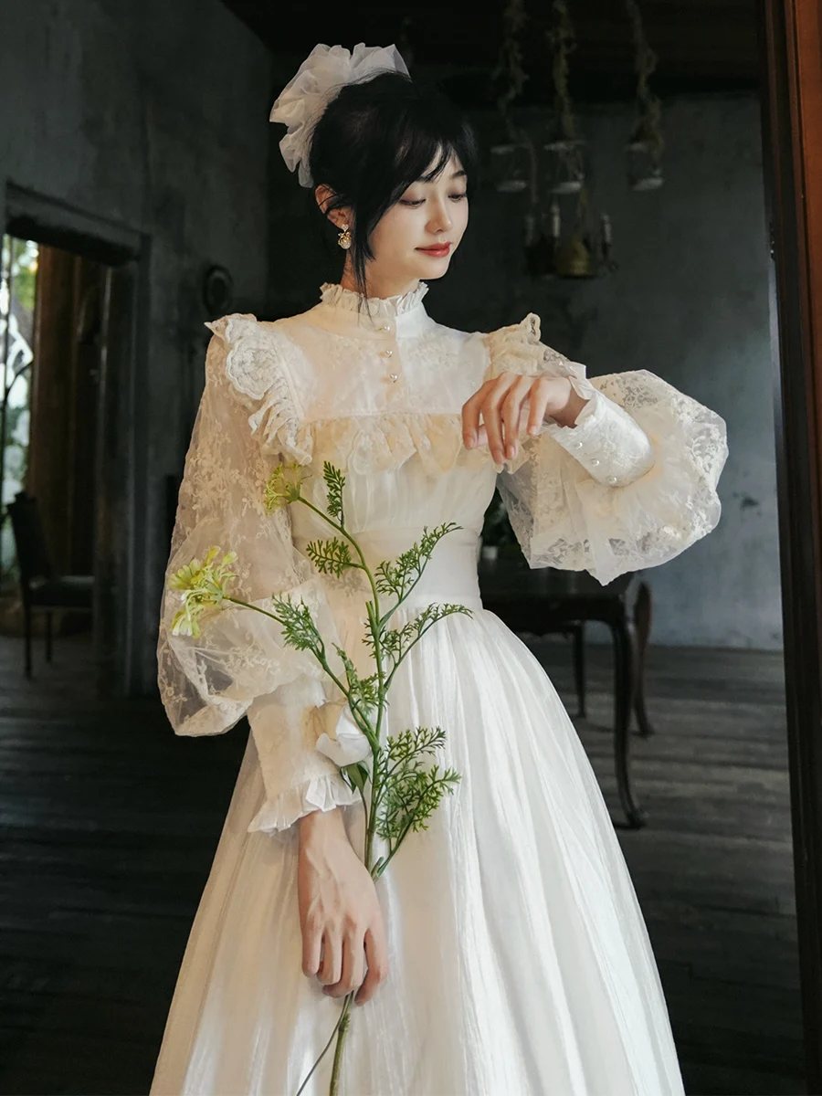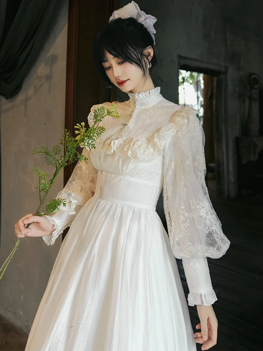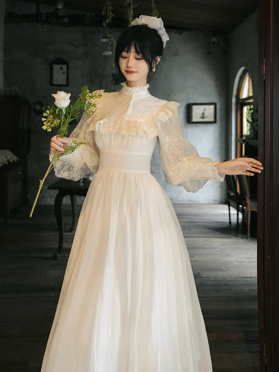 ♡Quick viewTIYIHAILEY 秋 レディース ワンピース フルランタンスリーブ ロング マキシ丈 XS-XL ヴィンテージ ハイウエスト レース スラッシュネック ホワイト レースアップ 202515014 JPYHot