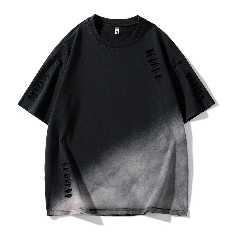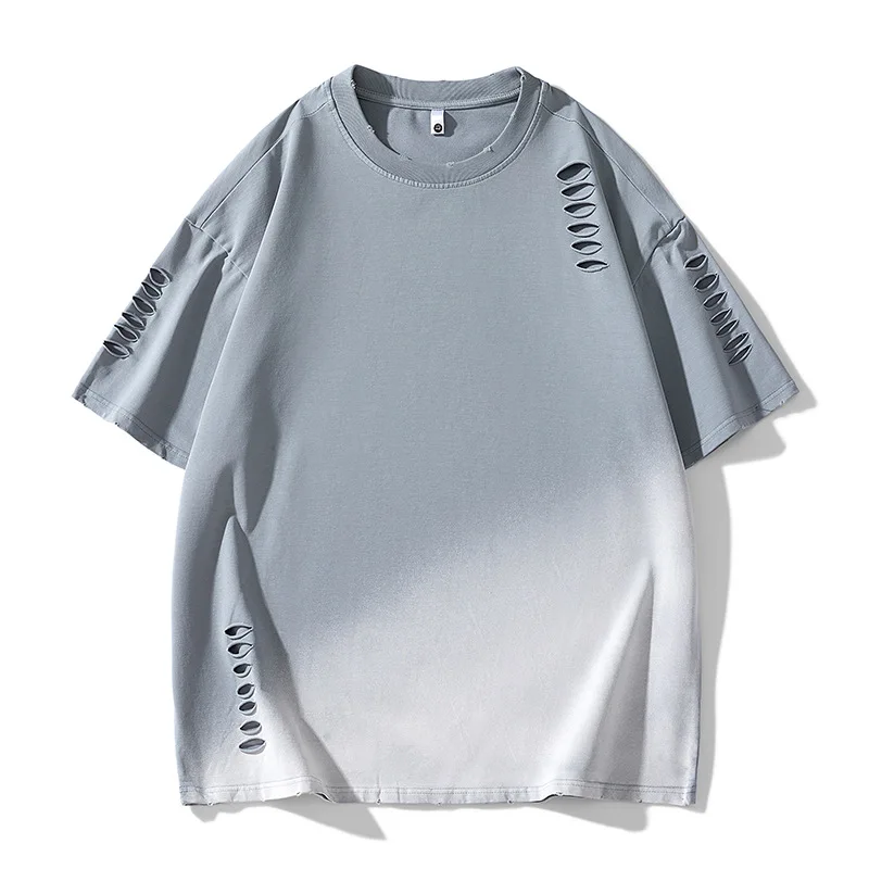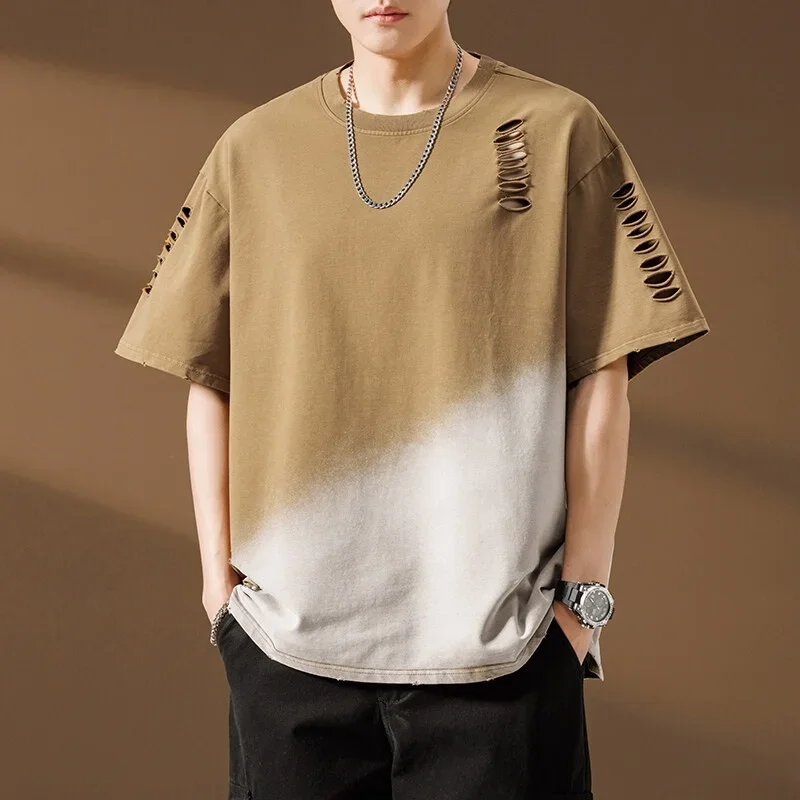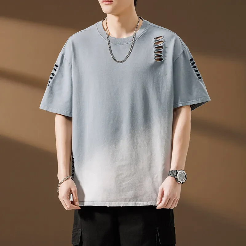 ウォッシュドグラデーションカラーメンズTシャツプラスサイズM-8XL半袖Tシャツ穴あきルーズフィットクルーネックトップス男性用サマーカジュアルウェア - TopDealBox
