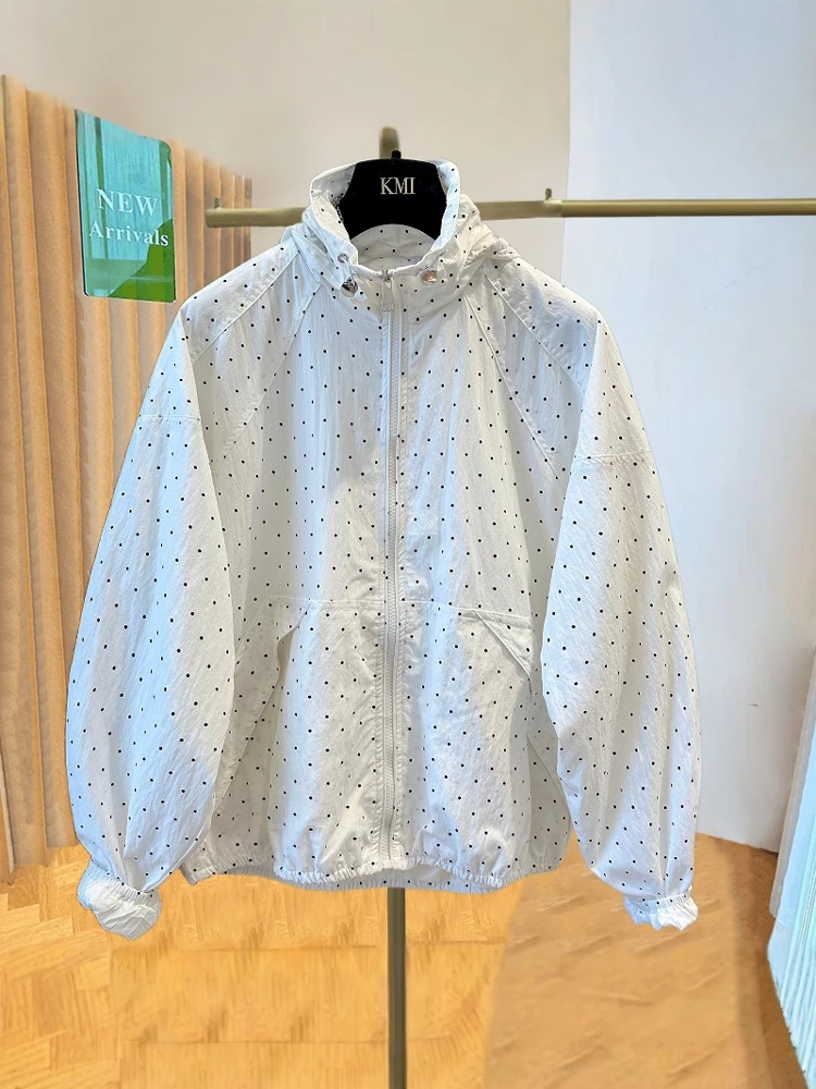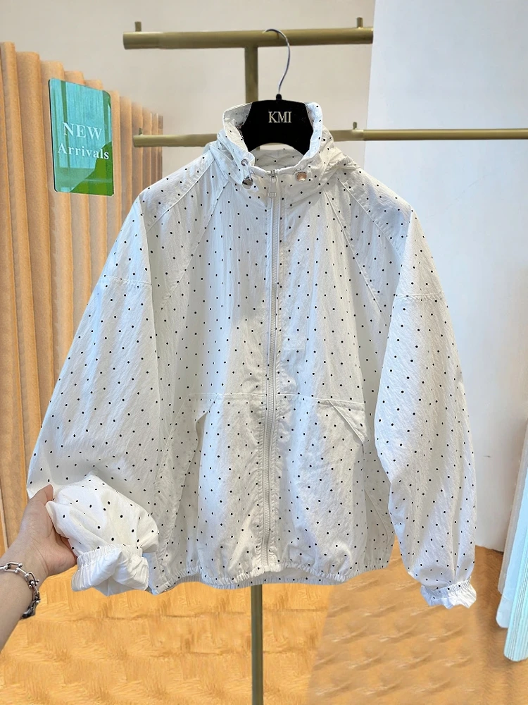 女性の水玉模様のフード付き UV 保護服カジュアルルーズフィット夏のファッションアンチエイジングアウターウェアジッパー開閉長袖 - TopDealBox
