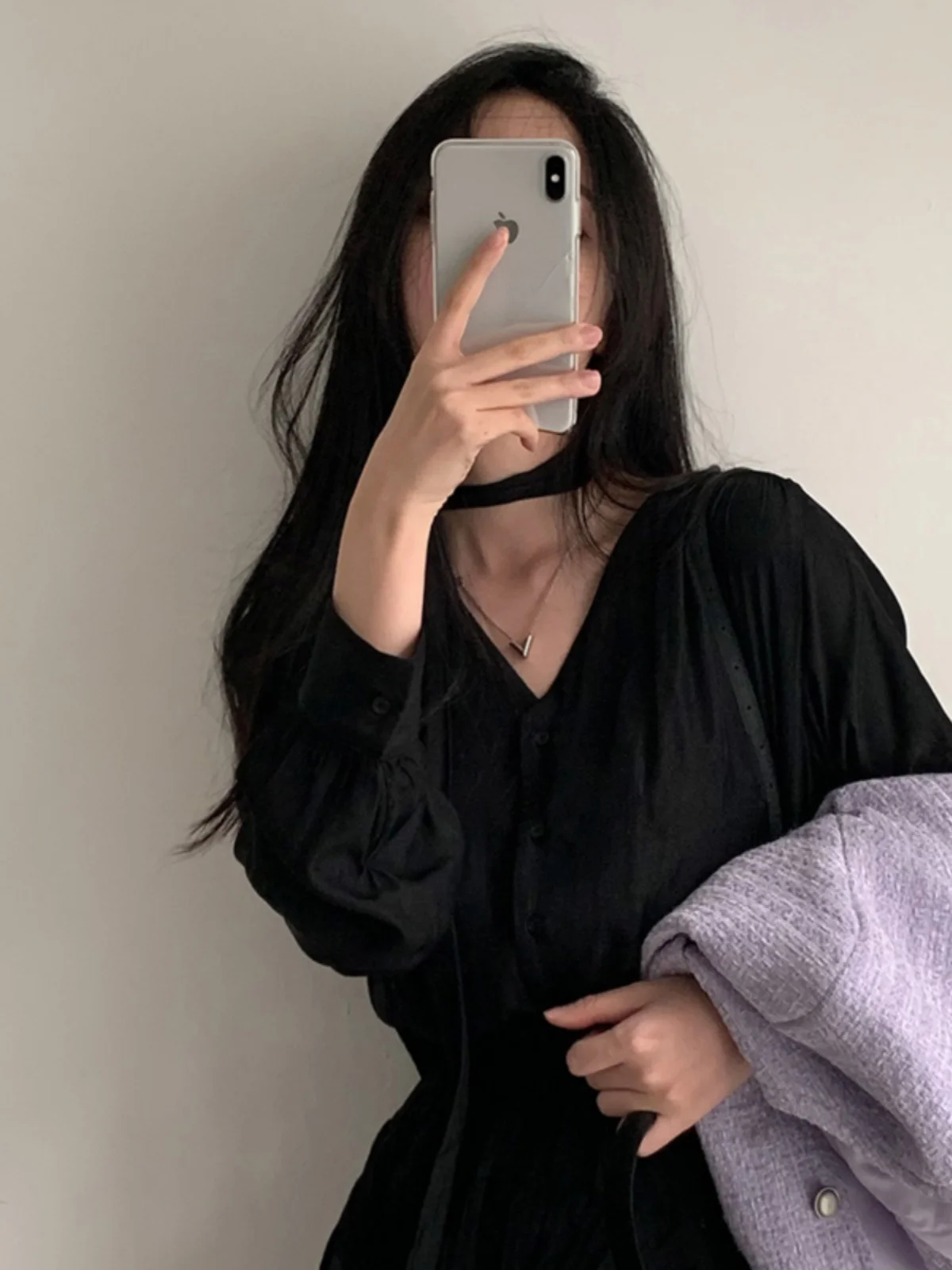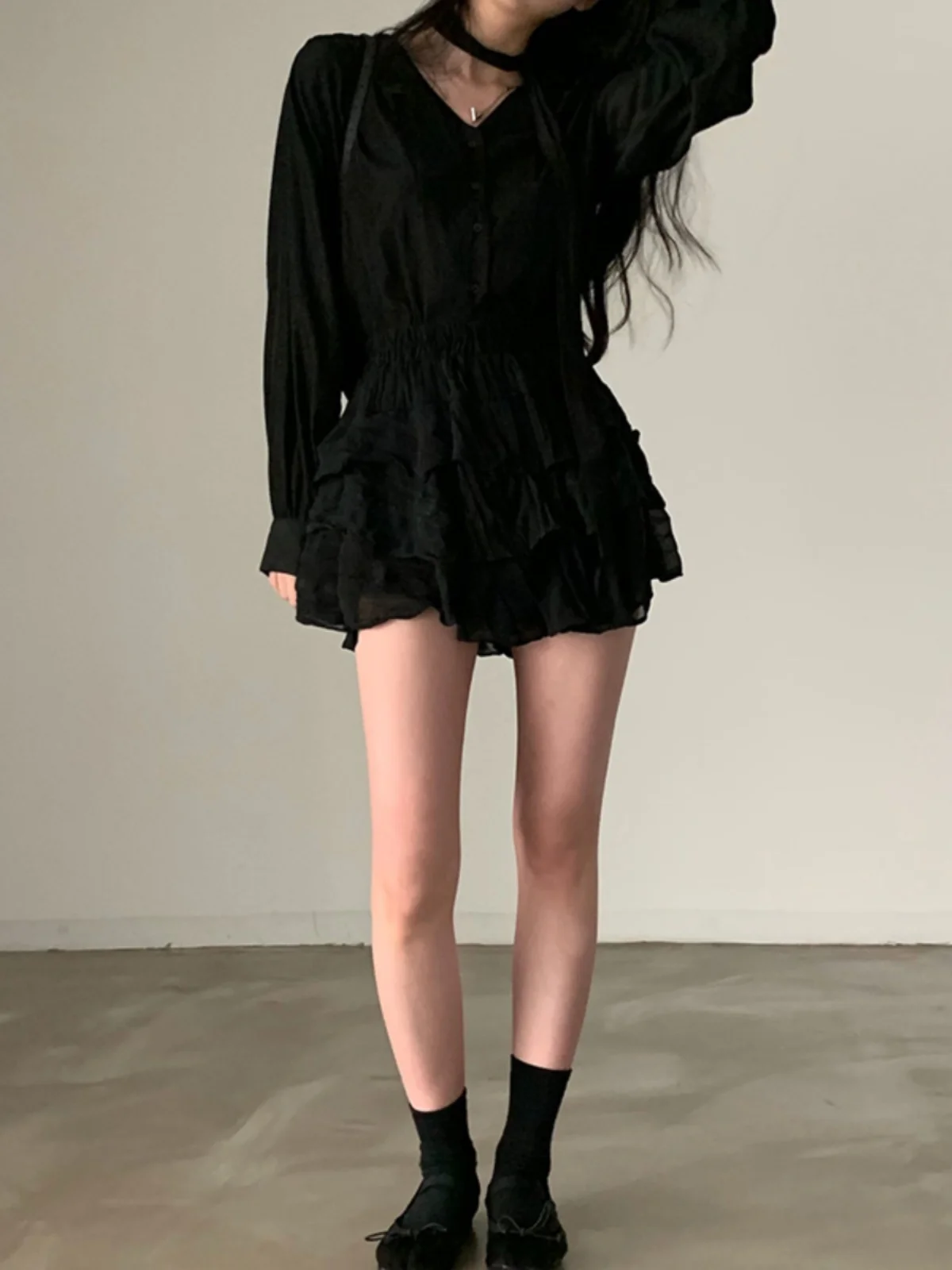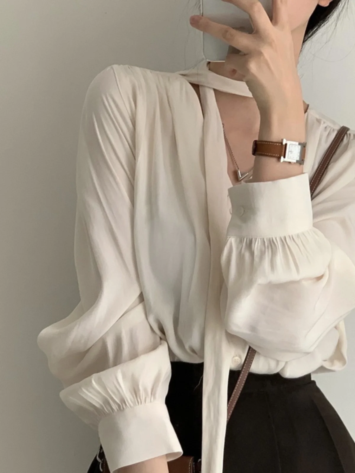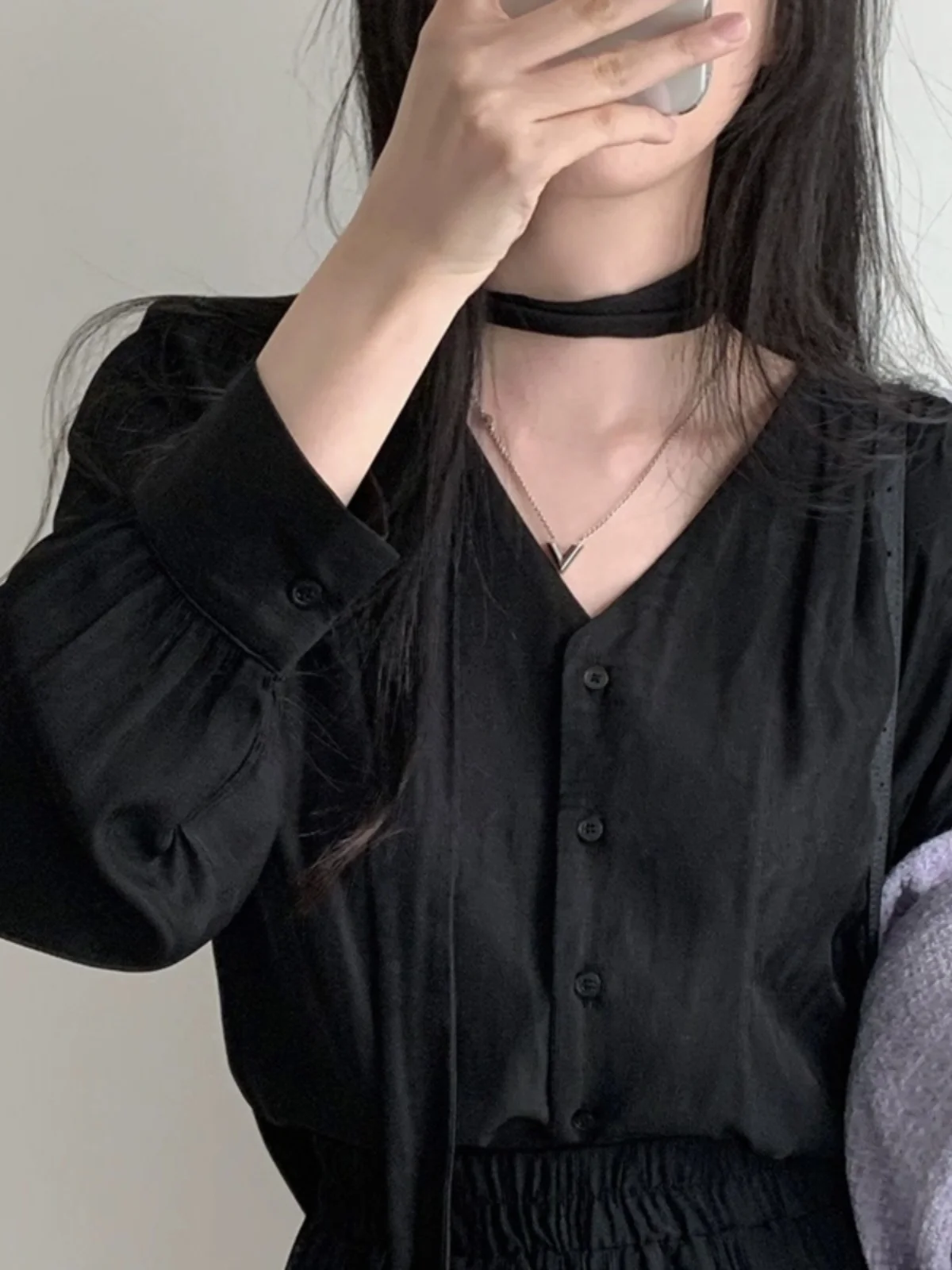 シックな V ネック長袖シャツ女性のシングルボタン蝶ネクタイバブルスリーブデザインブラックトップ韓国スタイル通勤ピュアカラー - TopDealBox