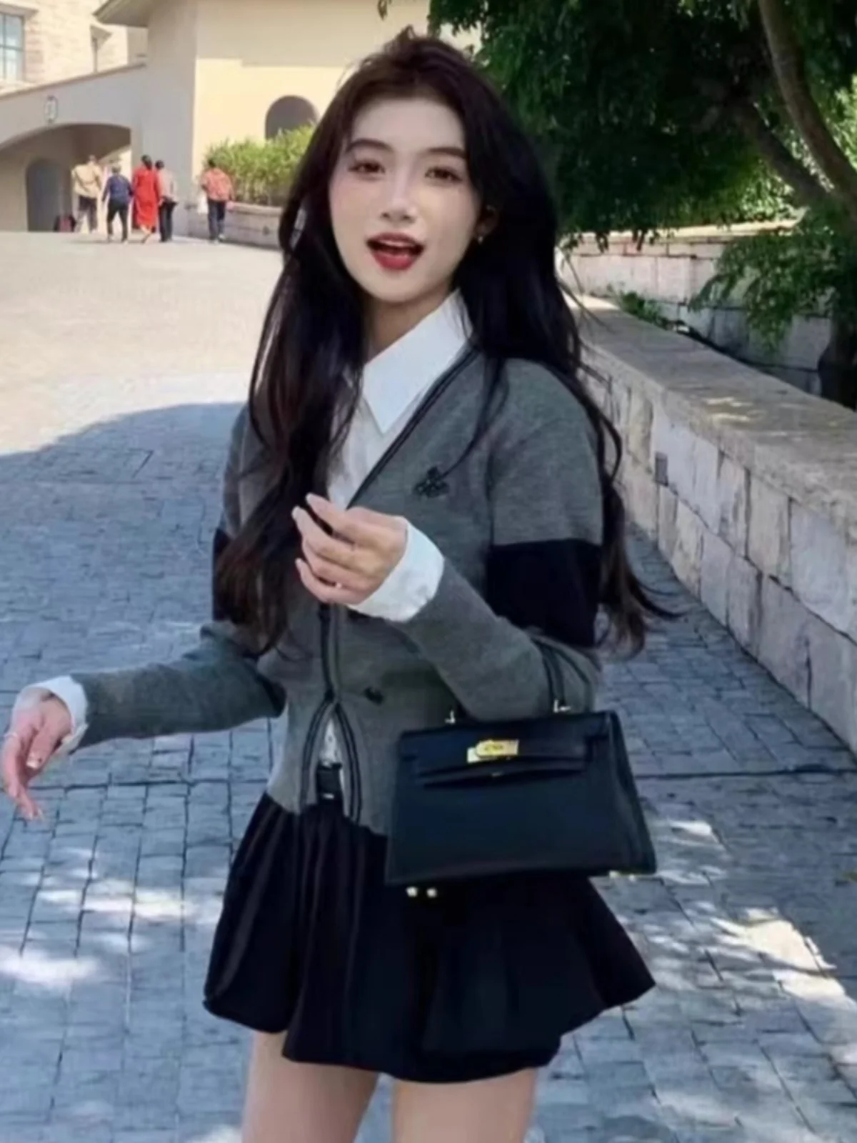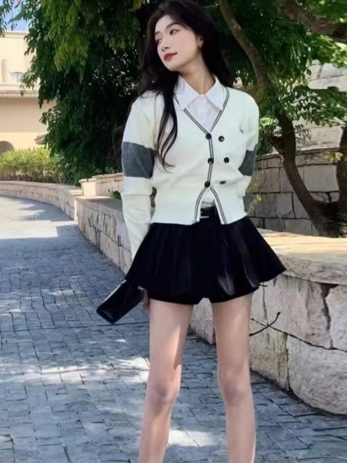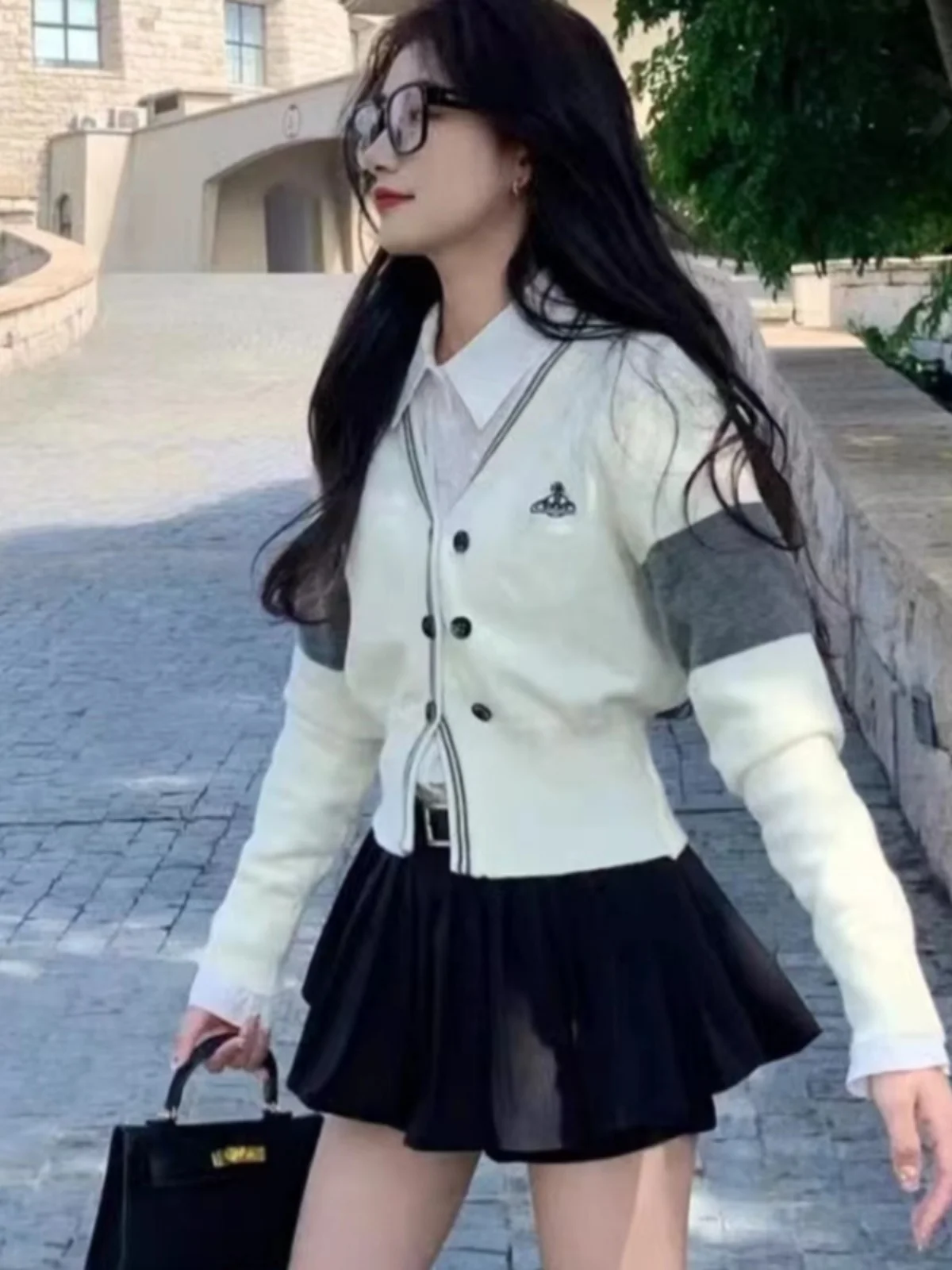 スリムフィット V ネックニットカーディガン女性のショートスタイル韓国語バージョンカレッジスタイルアウター秋冬ファッション必需品 - TopDealBox