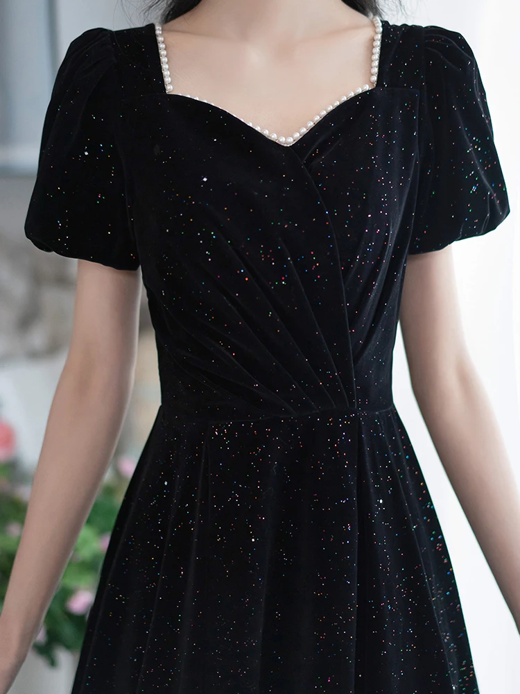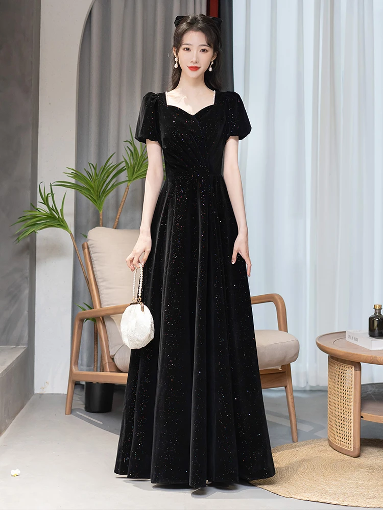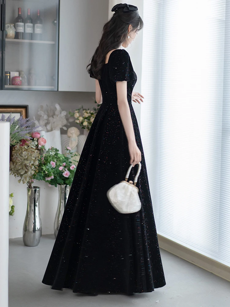 エレガントな黒のイブニングドレス女性のセレモニーホストパフォーマンスドレス韓国スタイルポリエステルロングスカート半袖 V ネック - TopDealBox