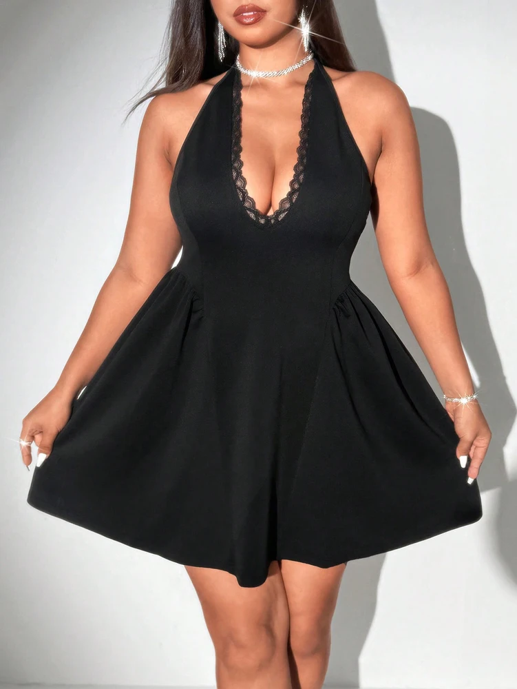 プラスサイズ 春夏新作 ワンピース Vネック セクシーなレーストリム ノースリーブ パフスカート イブニングドレス 無地 - TopDealBox