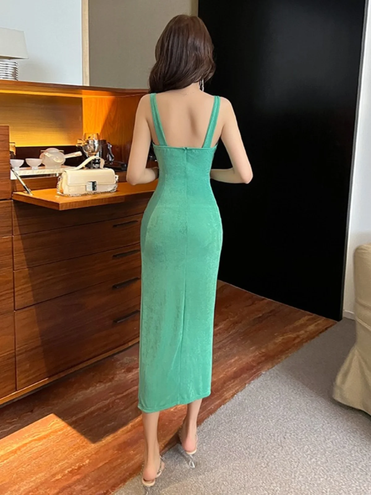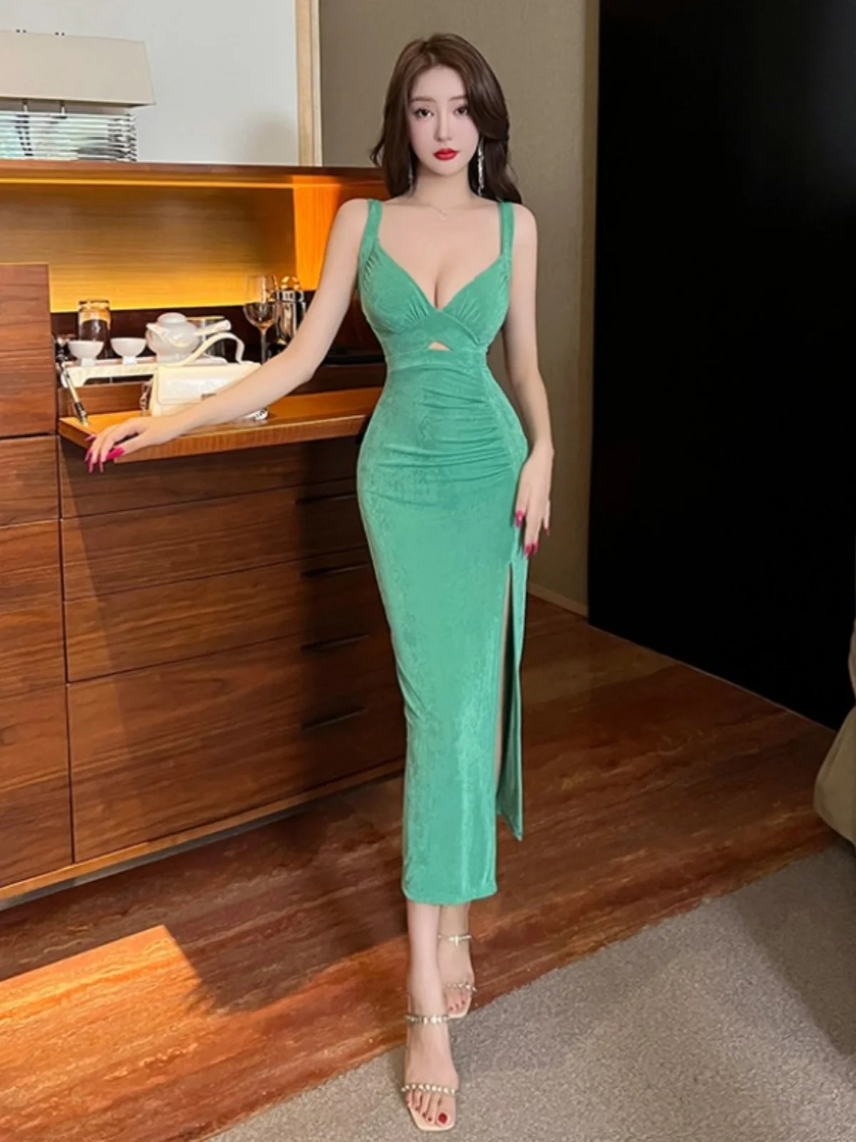 エレガントでセクシーなローカット V ネックロング痩身スプリットドレス会社パーティーフォーマルドレスイブニングドレスディープ V ネックラインハイウエスト - TopDealBox