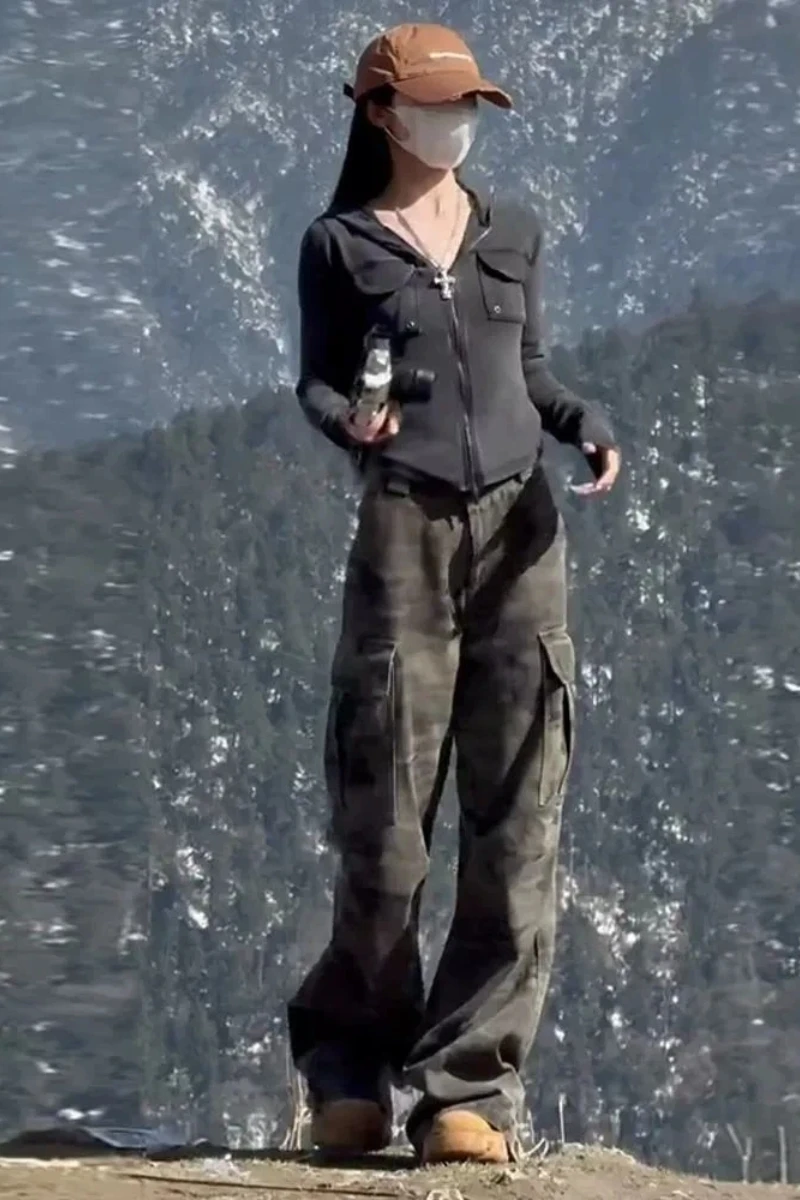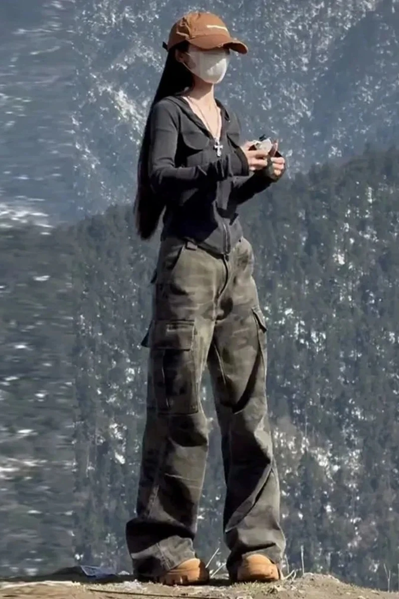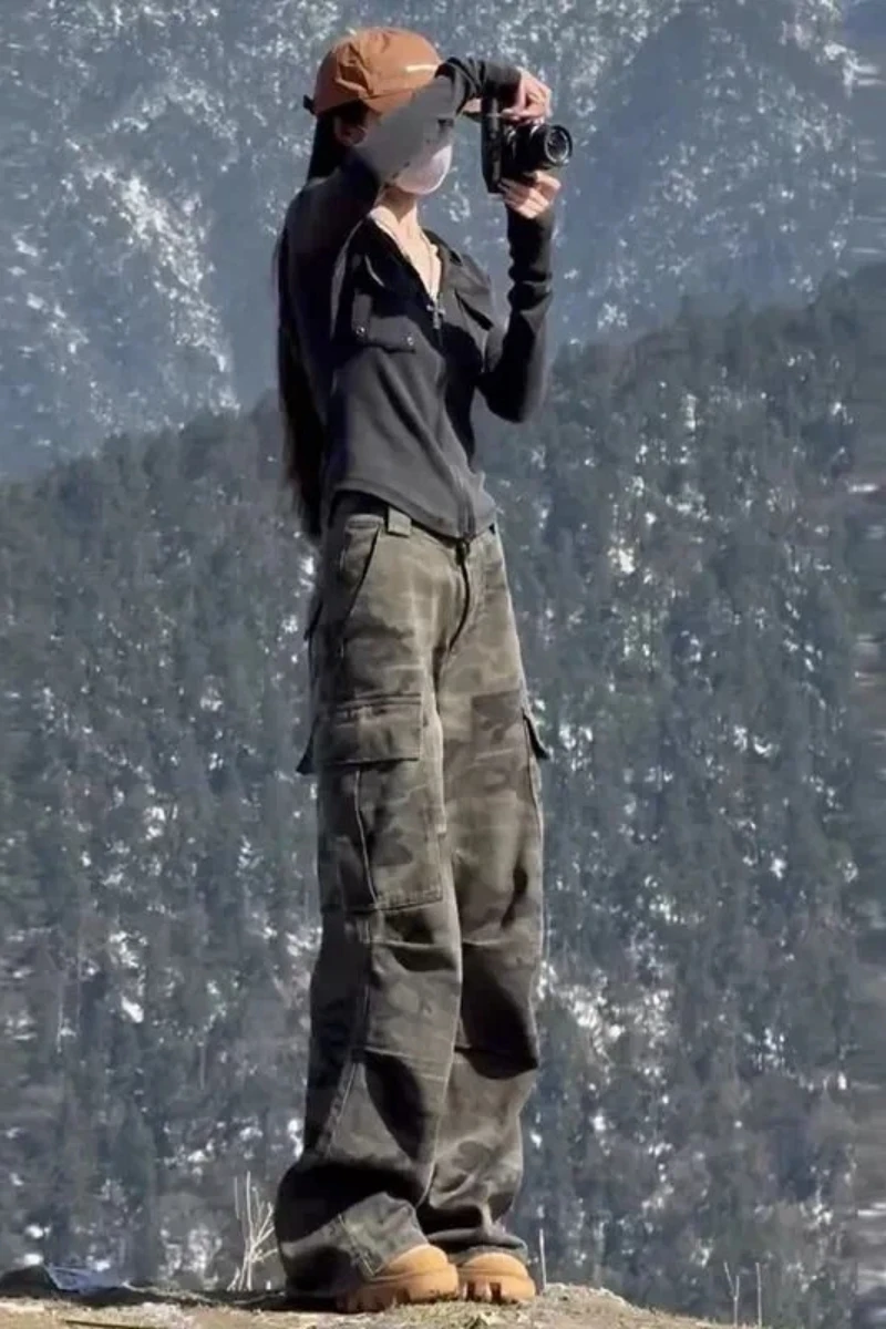 Y2Kファッション レディース ハイウエスト フレアパンツ 迷彩柄 カーゴパンツ ワイドレッグ ストレートパンツ 冬新作 スリムフィット ファッション - TopDealBox