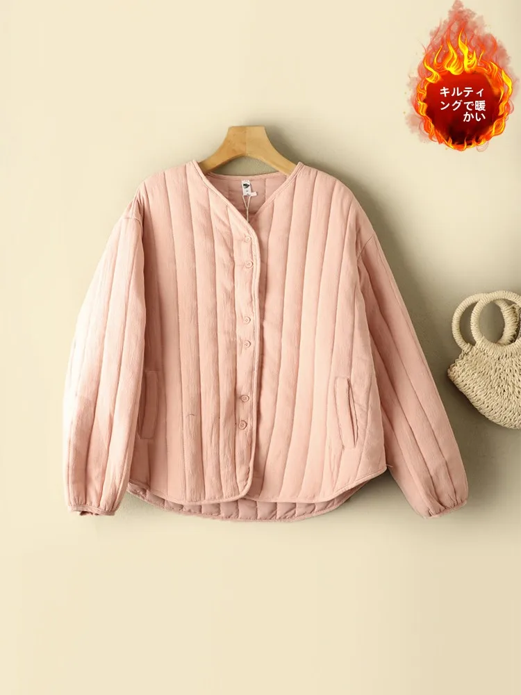 暖かいコットンジャケットインナー裏地縦ストライプ大きいサイズの女性のピュアカラーサーマルコットンコートアウターアンチエイジング綿服