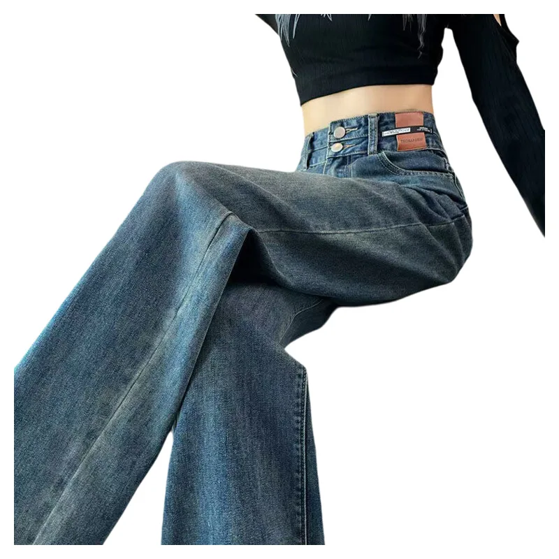 プラスサイズフリース裏地ワイドレッグジーンズ女性ハイウエストストレートカットルーズフィットフロアレングスパンツ秋冬セメントグレー