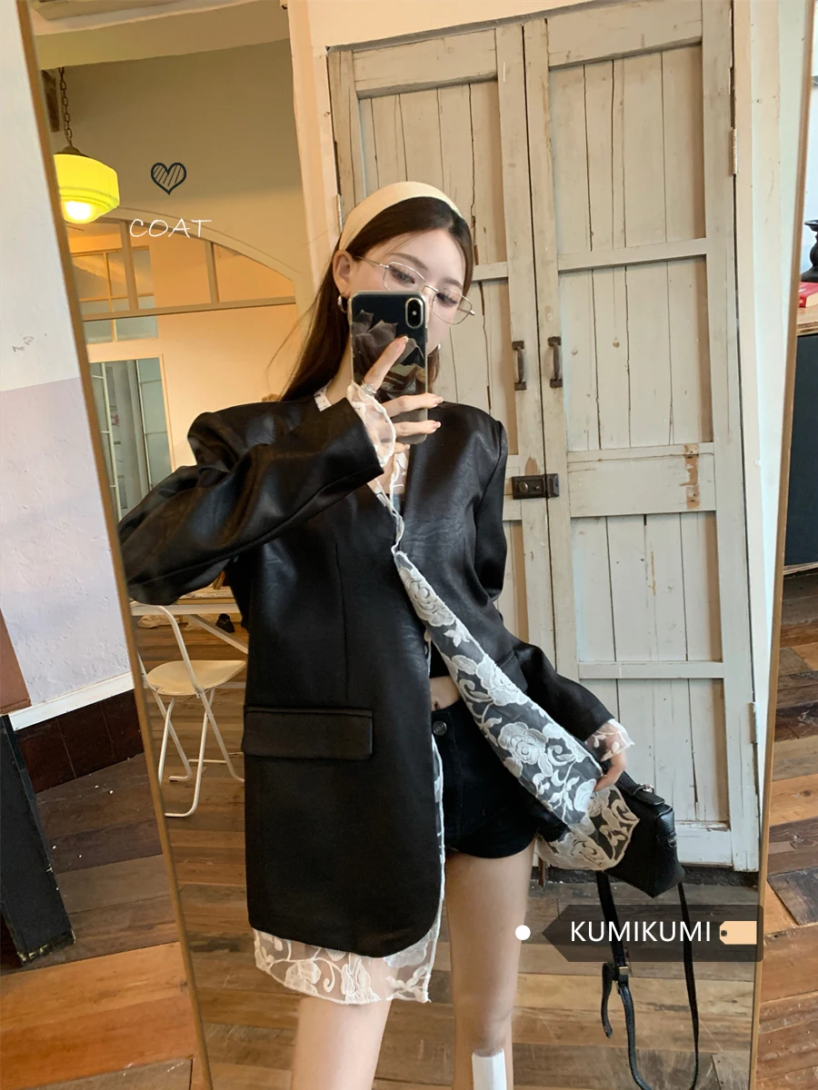 レトロレーススプライシング長袖レザージャケット女性のルーズ痩身ミッドレングストップ春通勤スタイルファッショナブル