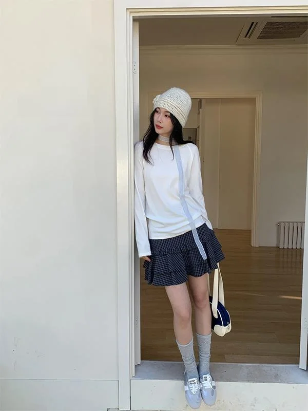 ハイウエストチェック柄ミニスカート、木目調エッジケーキスタイルAラインスカート、レディース秋物カジュアル、ポリエステル素材