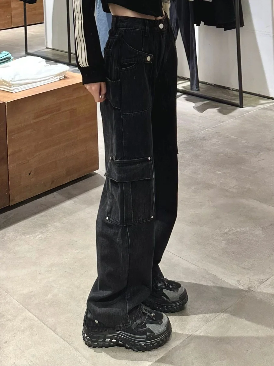 スパイシーガールアメリカンレトロハイストリートストレートレッグ作業服ジーンズ女性プラスサイズ春秋デザインワイドレッグパンツ
