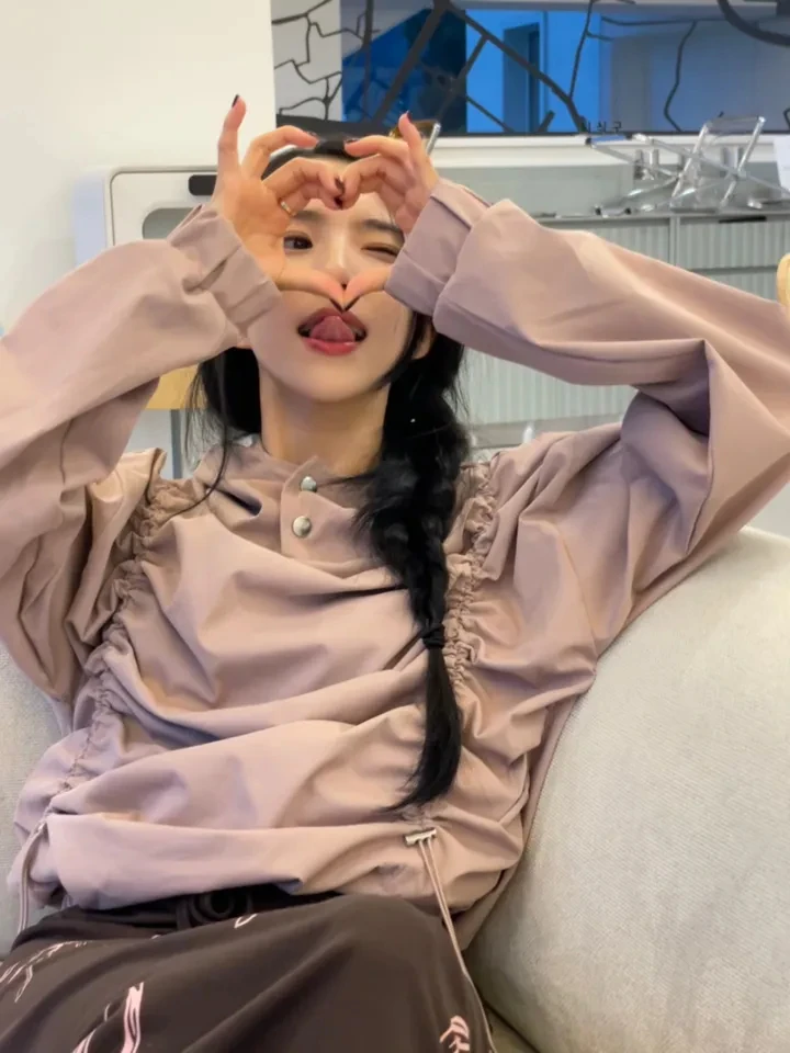 冬の新シンプルなソリッドカラーの機能的な折り目防風巾着フード付きスウェットシャツルーズ女性のストリートスタイル長袖
