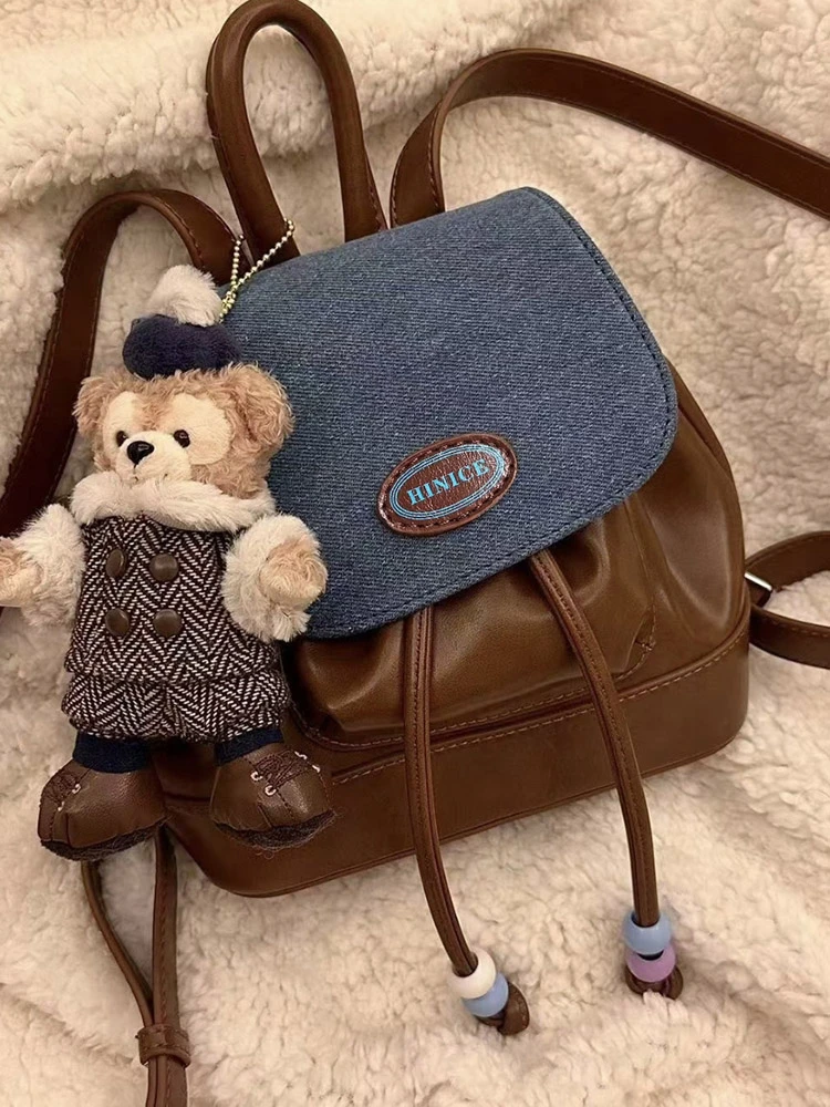 レトロかわいいデニムカラーブロックバックパック学生ガールショルダーバッグソフトハンドバッグ韓国スタイルレジャー防水小型バケツ形状